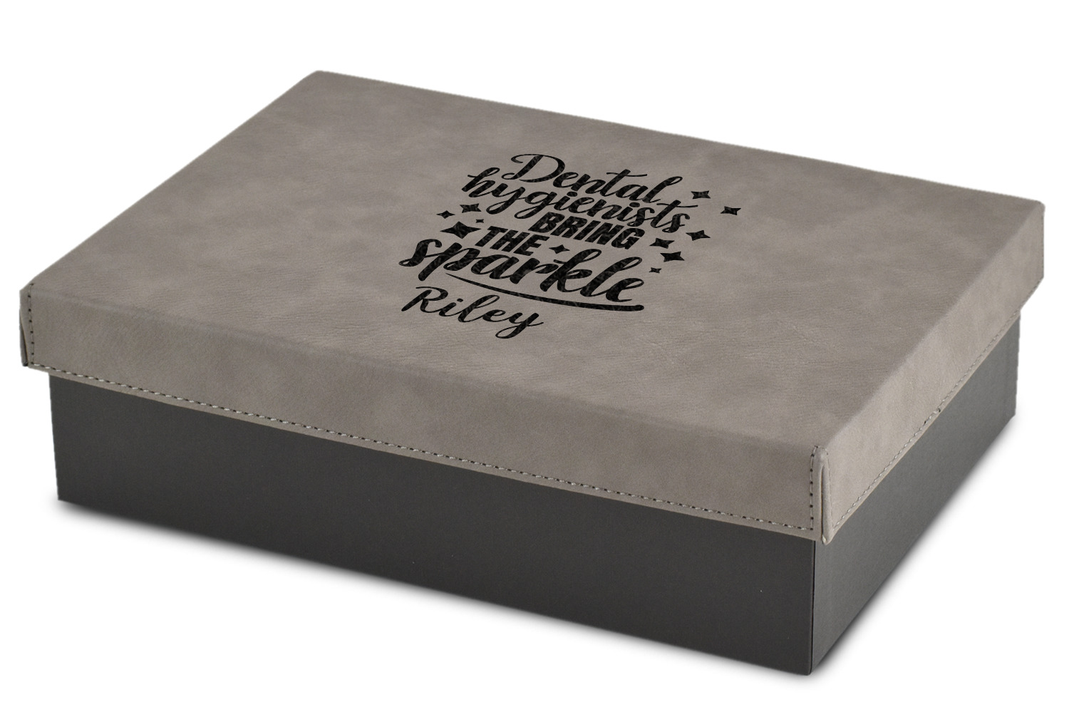 These gift boxes are available in 3 different sizes to accommodate various sized gifts. Available in gray as a neutral color for any occasion as well as to showcase your design boldly. Engraved with a laser this high quality paper board and faux leather gift box is unique and makes any gift stand out.