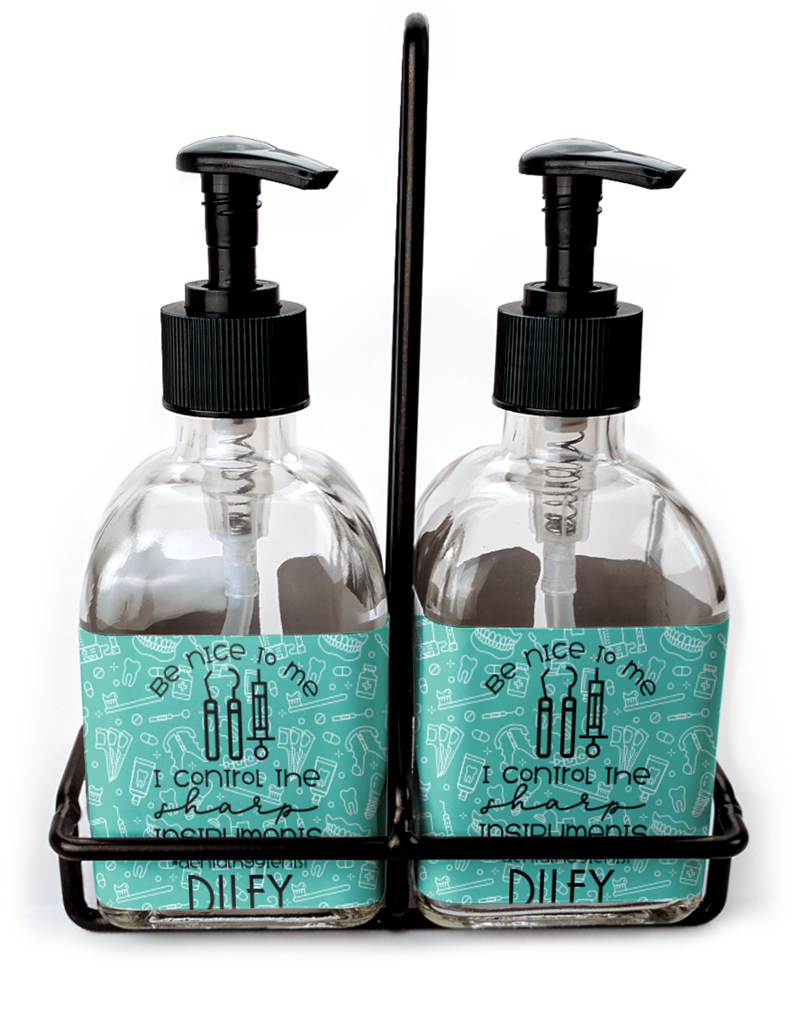 You can purchase these personalized soap dispensers as singulars, or as a set with two bottles. With your purchase of the set, we include a black frame that complements the black color of the pumps and adds to the overall classy look of the piece.