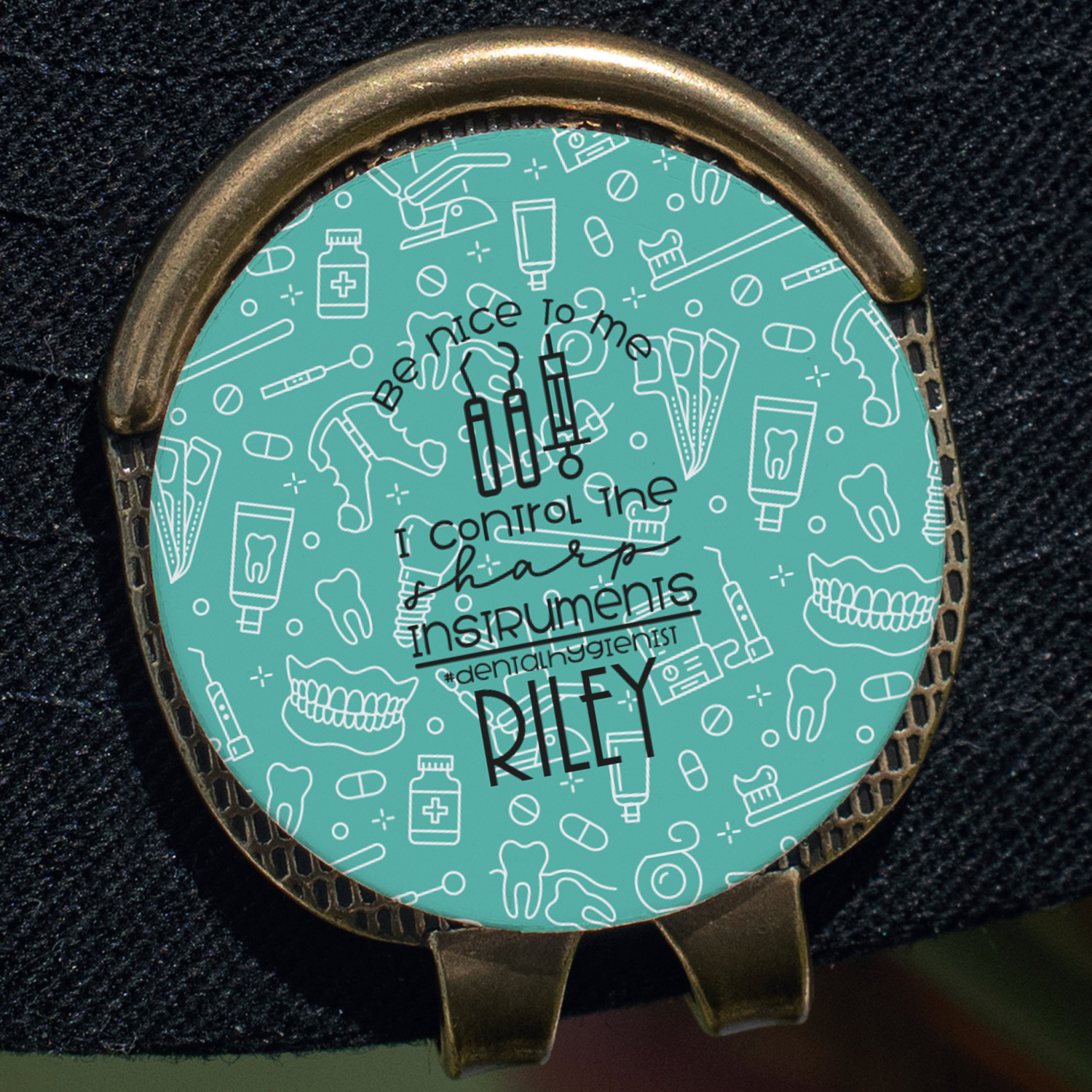 For the foreground, we used a fun quote that says "Be nice to me, I control sharp instruments #dental hygienist"Dental Hygienists bring the sparkle". We chose to personalize it with a name underneath. We used black for our color. You can customize the graphics, the colors as well as the personalization. Enjoy customizing it to make it yours.
