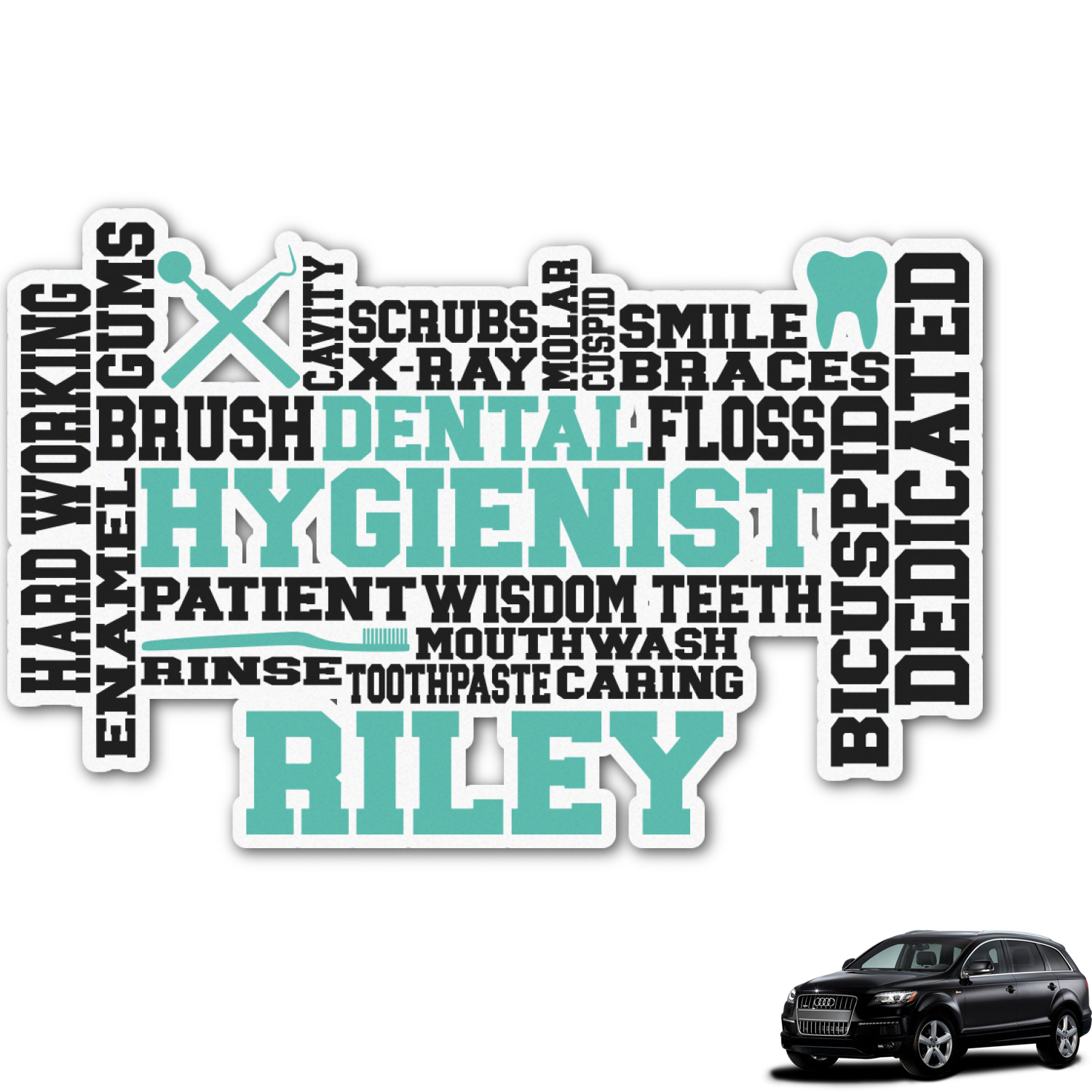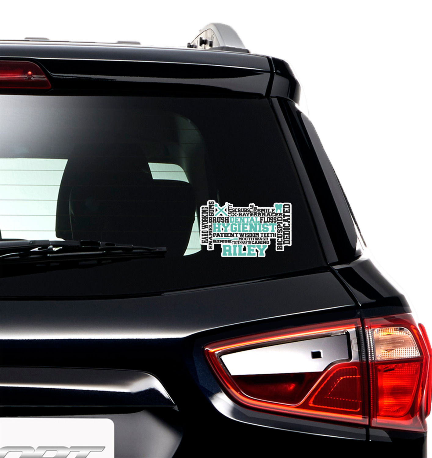 For the foreground, we used a fun quote that says "Be nice to me, I control sharp instruments #dental hygienist"Dental Hygienists bring the sparkle". We chose to personalize it with a name underneath. We used black for our color. You can customize the graphics, the colors as well as the personalization. Enjoy customizing it to make it yours.