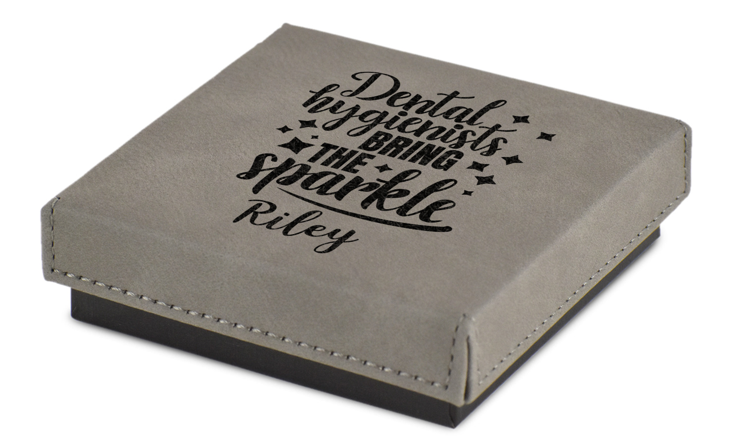 This jewelry gift box measures 3.5 inches long by 3.5 inches wide, and 1 inch deep. The box fits different sized jewelry items such as bracelets, necklaces, watches, earrings, rings and more. Engraved with a laser this high quality paper board and faux leather jewelry gift box is unique and makes any gift stand out.