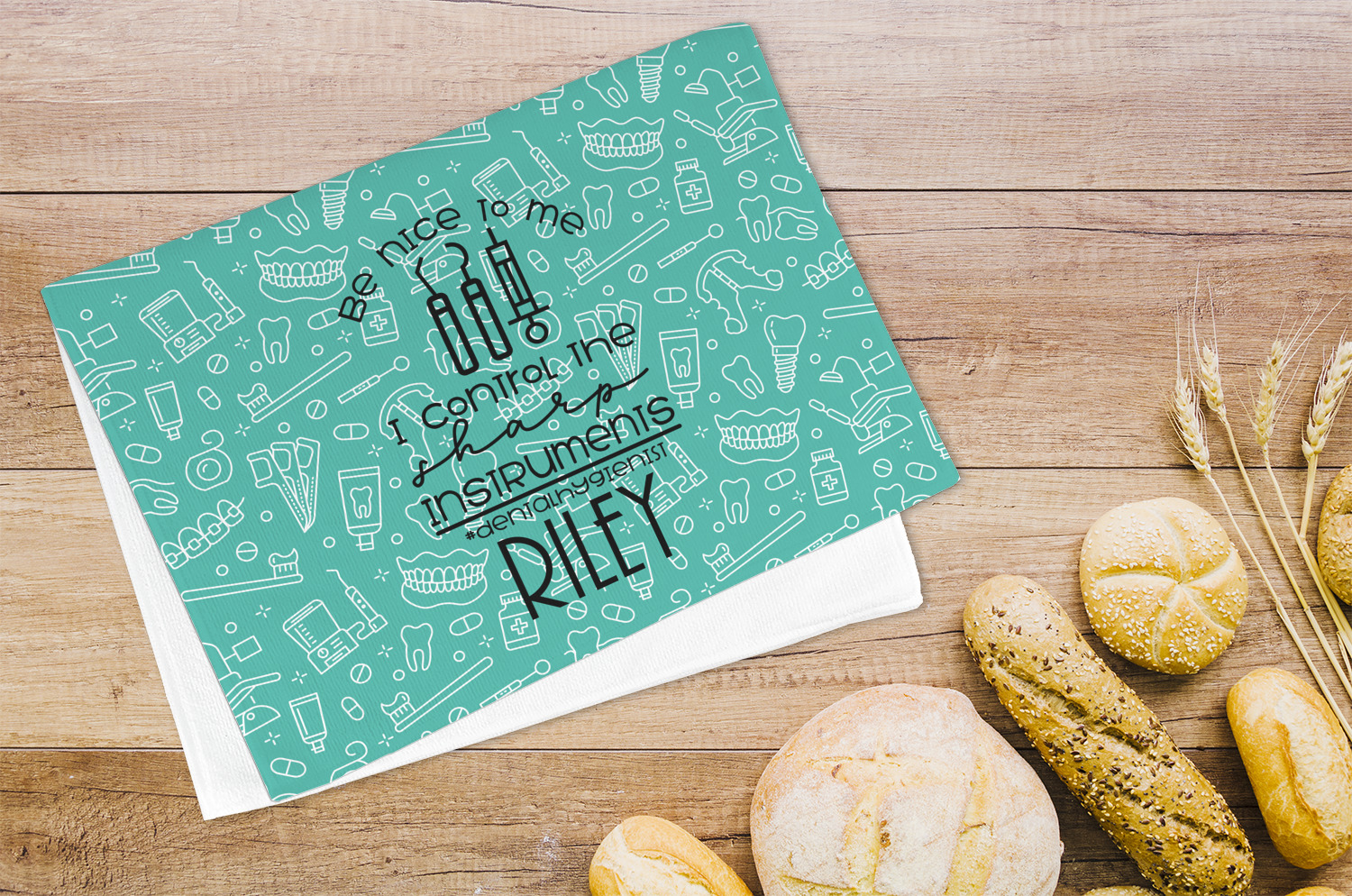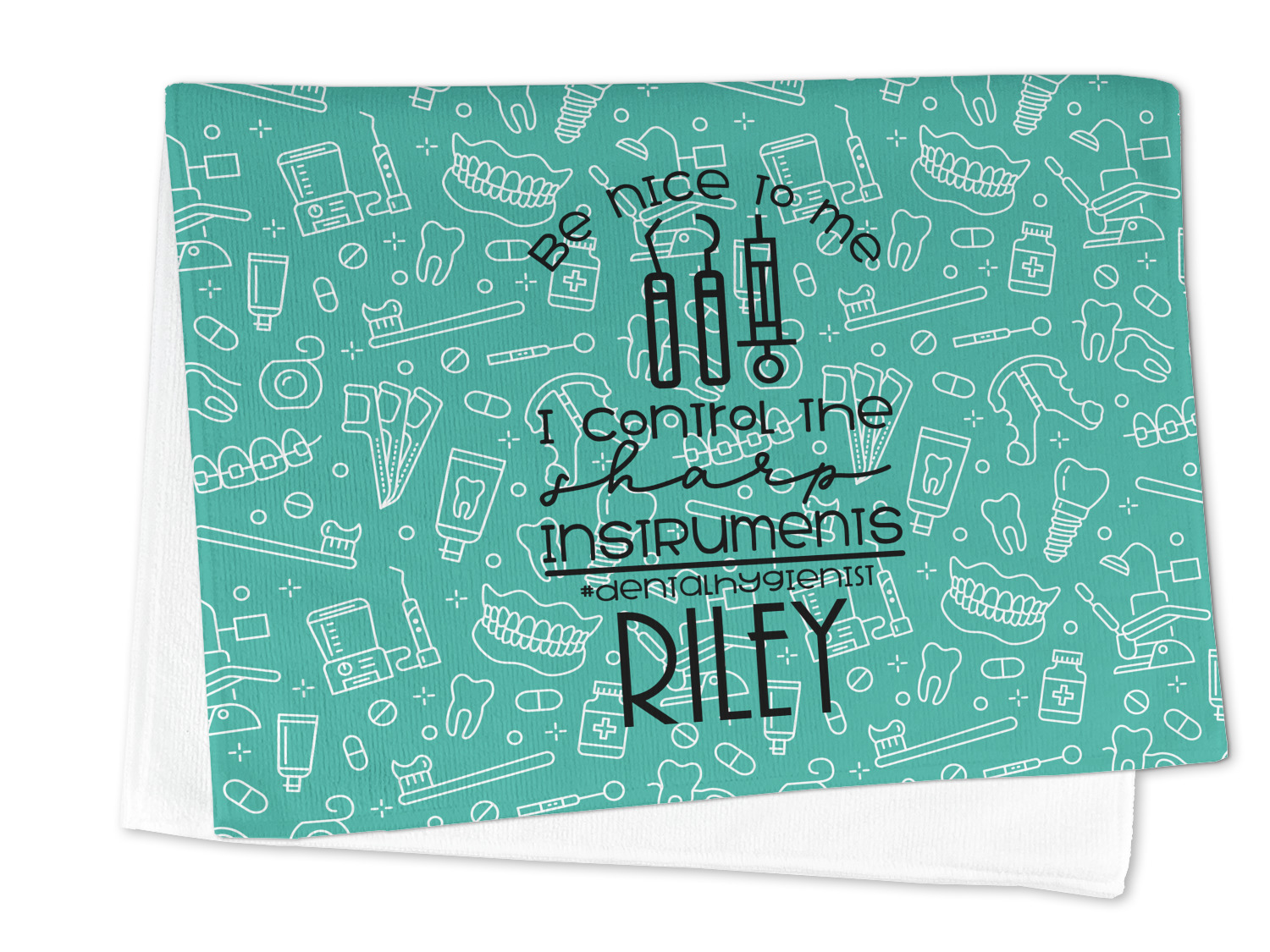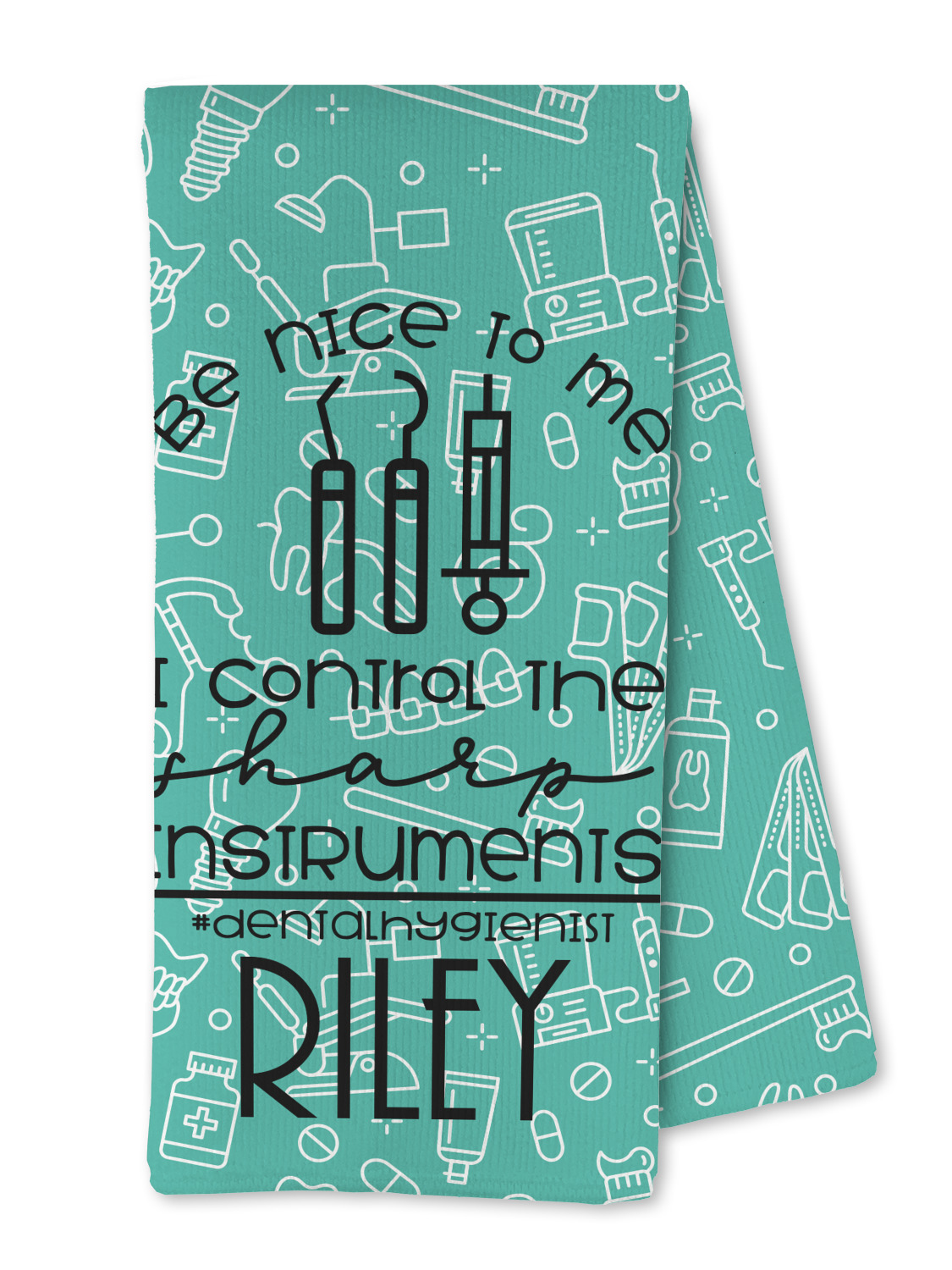 For the foreground, we used a fun quote that says "Be nice to me, I control sharp instruments #dental hygienist"Dental Hygienists bring the sparkle". We chose to personalize it with a name underneath. We used black for our color. You can customize the graphics, the colors as well as the personalization. Enjoy customizing it to make it yours.