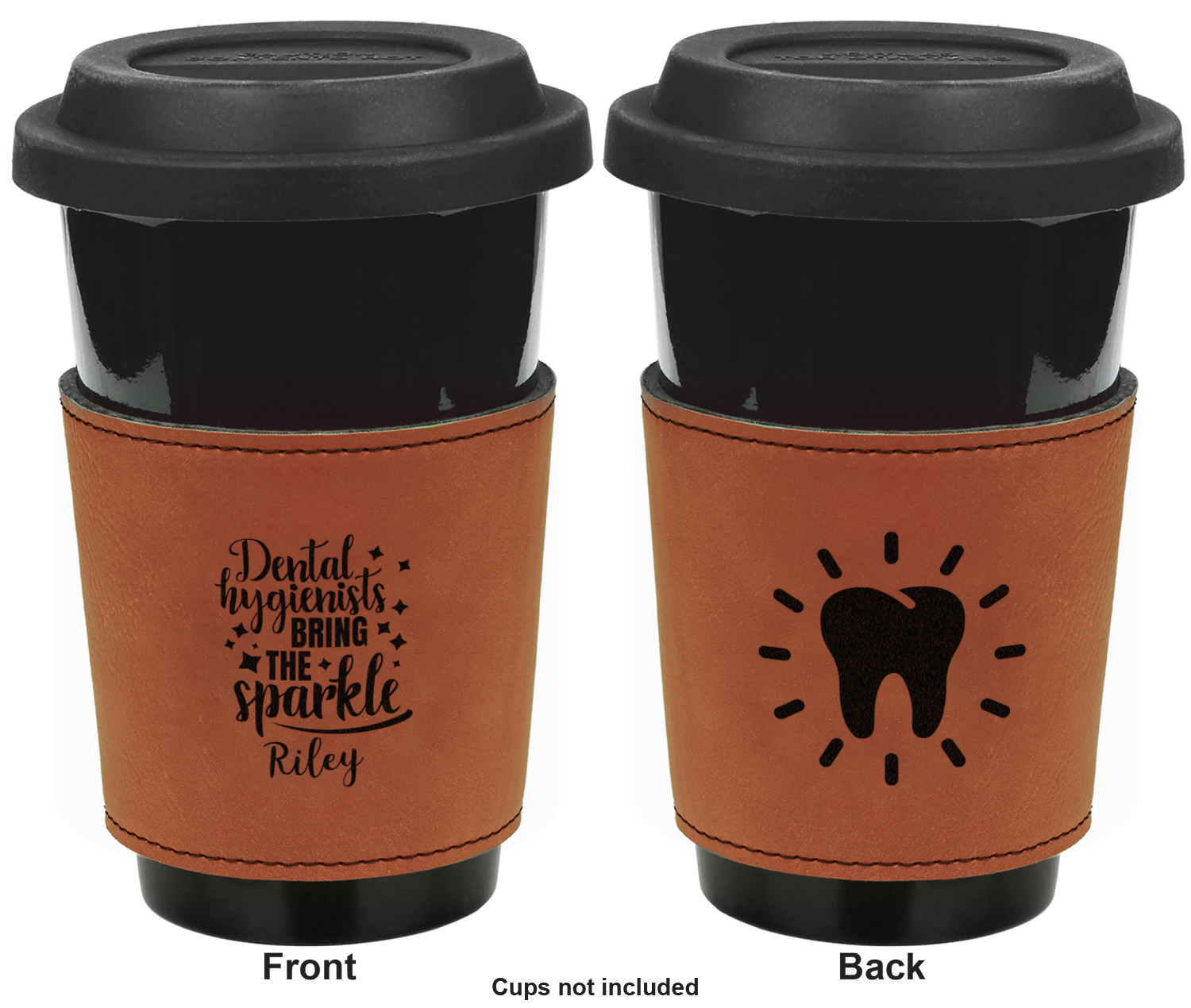 This cup sleeve is made from a suave, cognac-brown leatherette and finished with an intricate, black stitch. The interior of this can sleeve is fabricated from a thin foam material to help insulate your mug's contents. The sleeve is specifically made to suit tapered glasses or mugs, so the top's diameter is 3.5 inches, while the bottom's diameter is 2.75 inches. Your customized design will be laser engraved into the leatherette, leaving behind crisp, black imprint. With these products, we provide you with the option of engraving the front and back, or the front only.
