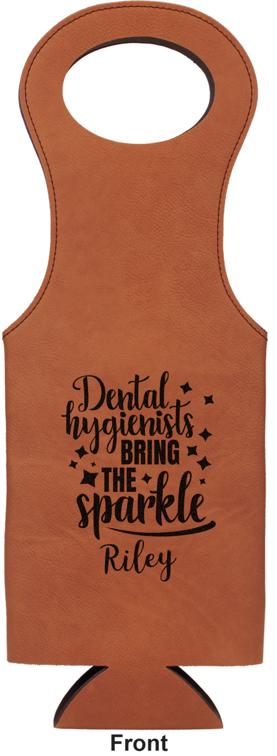 This wine carrier is made from a stunning leatherette, in a cognac-brown color. Strong, black stitching lines the sides of your wine bottle bag and provides extra durability. The interior is lined with a padded, black material to allow for a snug fit once your bottle is placed inside. At the top of this wine gift bag, you'll find two oval shaped handles that elegantly complements the rest of the bag's style. We provide you with the option of laser-engraving the front, or the front and back of your new personalized wine bag!