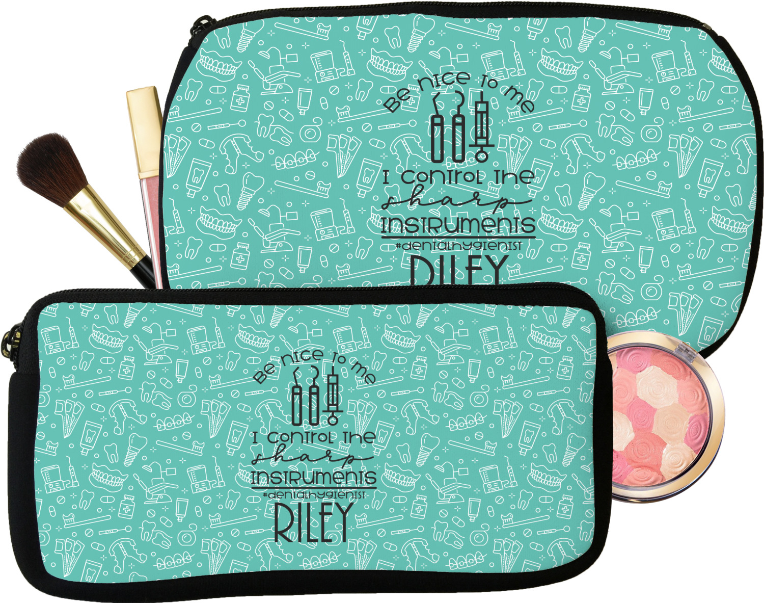 Our personalized makeup bags are available in many different designs, patterns and colors - so you are sure to find one that will love. They are made of neoprene (same material as wet-suits) and thus are water resistant, so spillages in your makeup bag will not end up all over you purse. They are customized on one side and are black on the other side and the zipper is black as well.