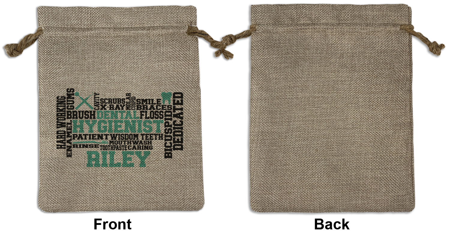 We sell our Burlap Gift Bags in 3 variant sized bags. Made with burlap polyester, each personalized bag can be secured with a twine drawstring pull. Your custom design is available to print on one side or both sides - completely up to you! The sizes of the bags measure approximately 4.5" x 6.5" for the smallest size, 6.5" x 8.0" for the medium size, and 6.5" x 13.5" for the large-sized bag.