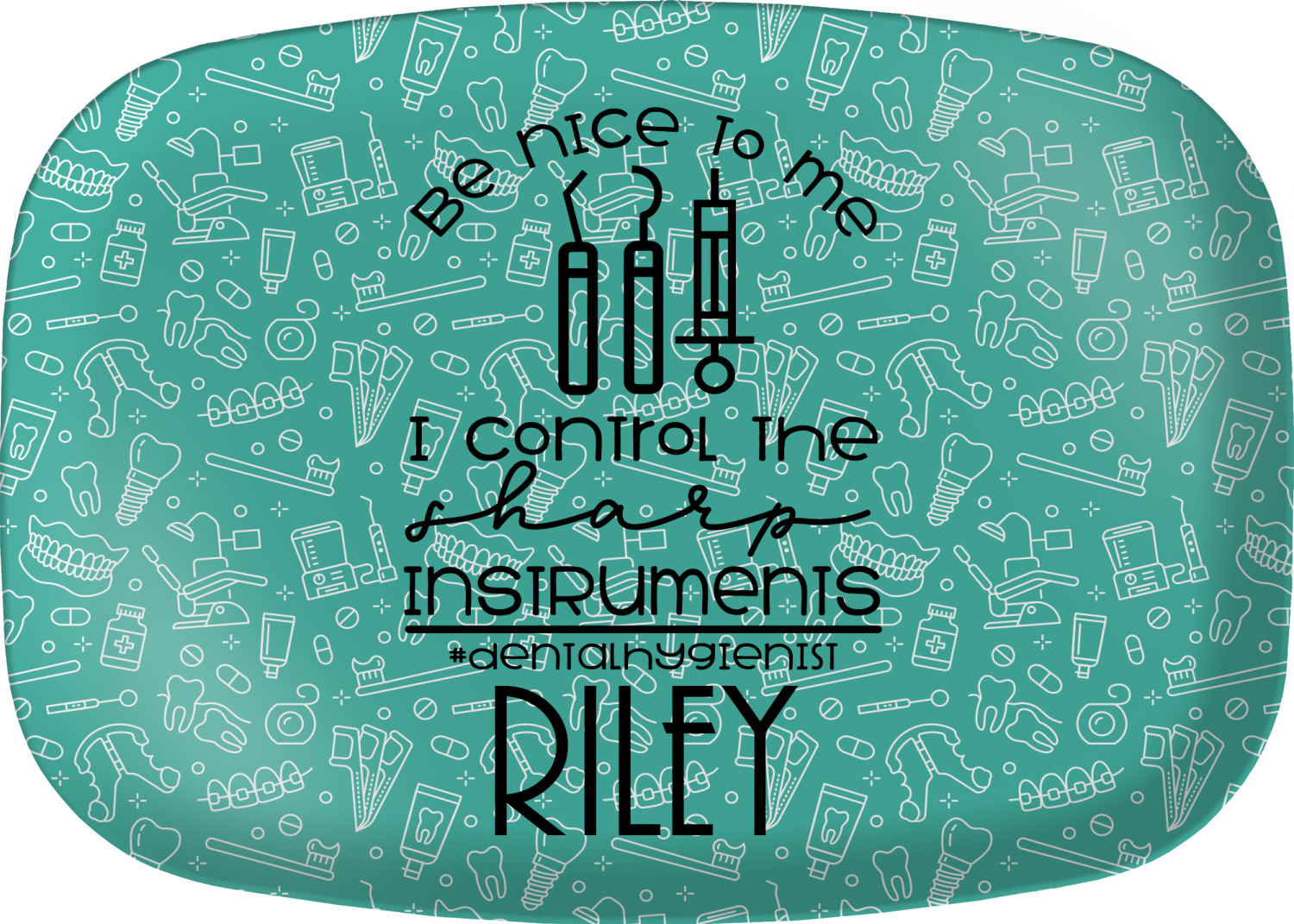 For the foreground, we used a fun quote that says "Be nice to me, I control sharp instruments #dental hygienist"Dental Hygienists bring the sparkle". We chose to personalize it with a name underneath. We used black for our color. You can customize the graphics, the colors as well as the personalization. Enjoy customizing it to make it yours.
