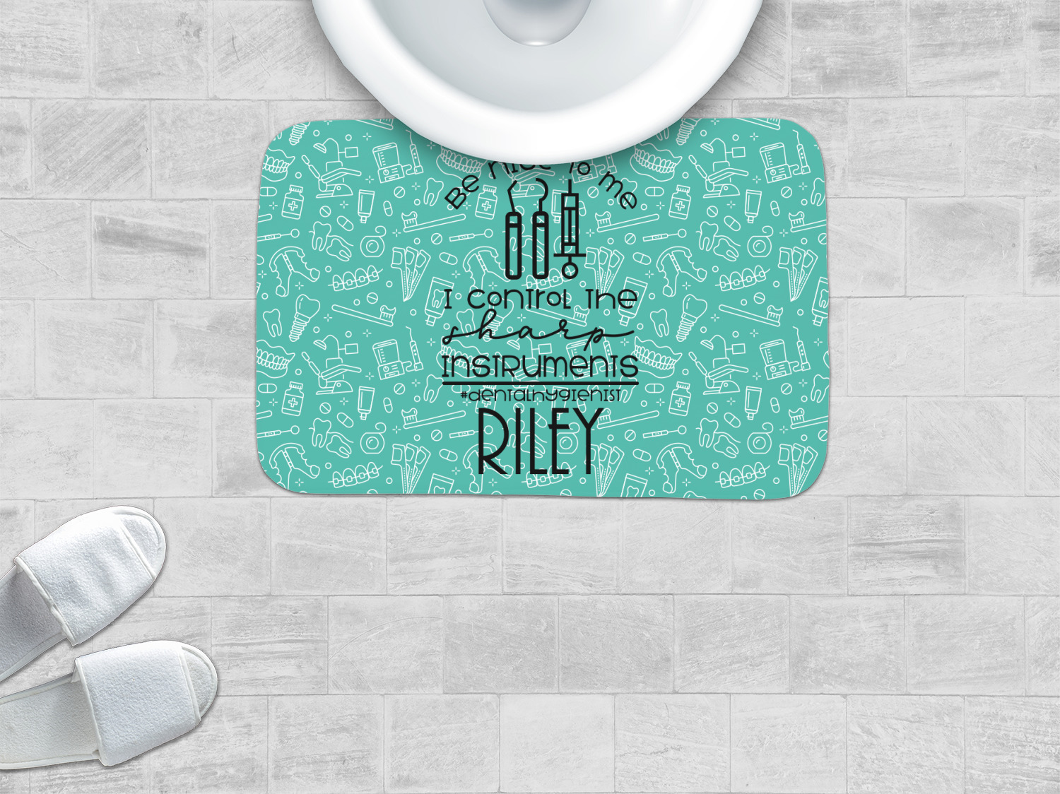 For the foreground, we used a fun quote that says "Be nice to me, I control sharp instruments #dental hygienist"Dental Hygienists bring the sparkle". We chose to personalize it with a name underneath. We used black for our color. You can customize the graphics, the colors as well as the personalization. Enjoy customizing it to make it yours.