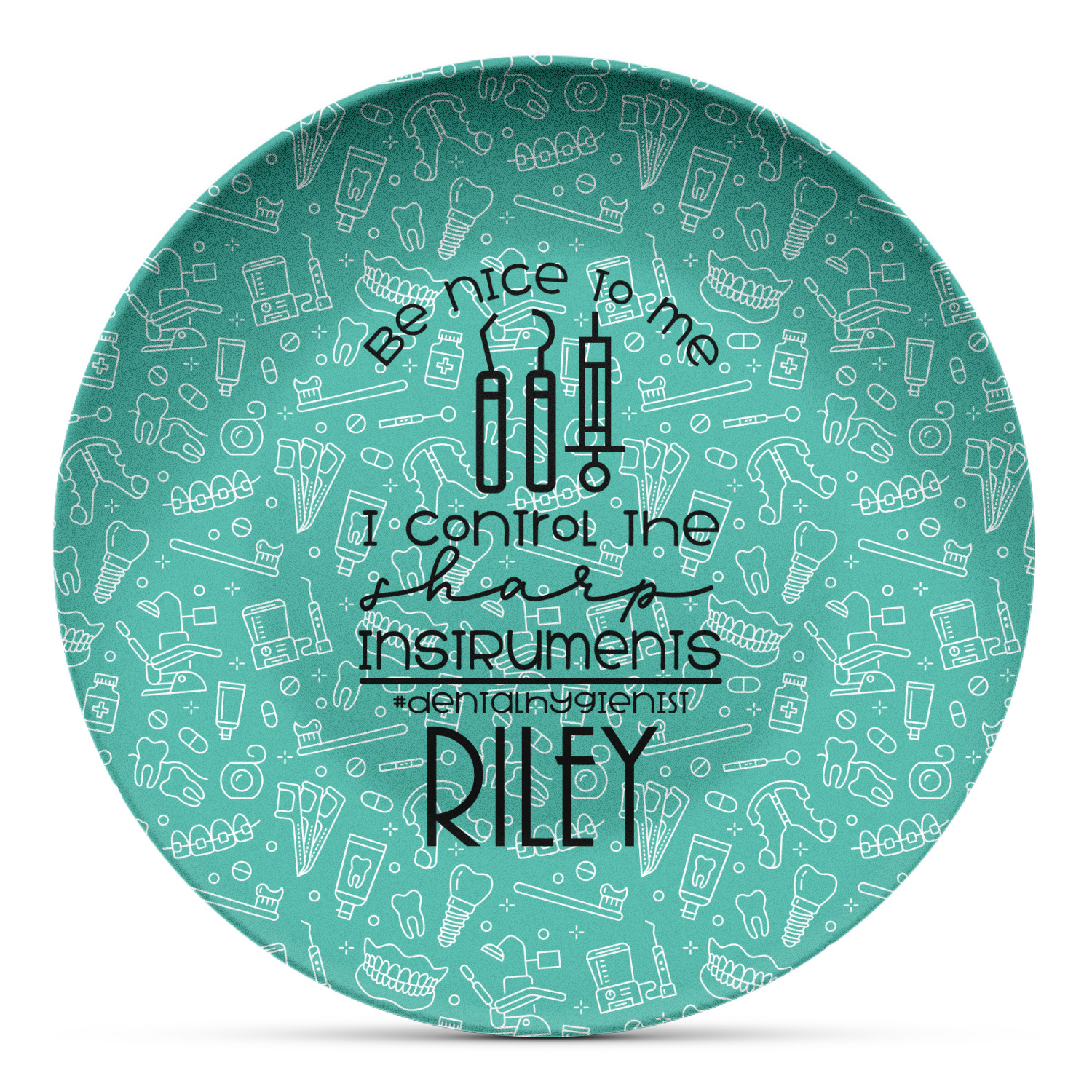 For the foreground, we used a fun quote that says "Be nice to me, I control sharp instruments #dental hygienist"Dental Hygienists bring the sparkle". We chose to personalize it with a name underneath. We used black for our color. You can customize the graphics, the colors as well as the personalization. Enjoy customizing it to make it yours.