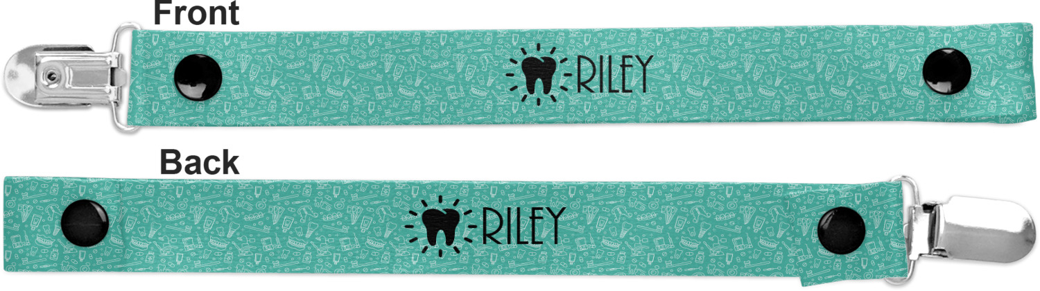 This personalized pacifier clip is the ideal size and measures at approximately 7.5 inches in length, when either end is snapped closed. On one end, you'll find a snap button. This button of your baby's pacifier holder is what can be attached to their pacifier to hold is securely in place. Simply open the snap, slip it through the pacifier opening, and snap it back into place. On the opposite end of this baby pacifier holder, you'll find a metal clip that can secure to a baby's collar or sleeve. This clip ensures that the strap stays in place, and that your baby's pacifier is always on hand.