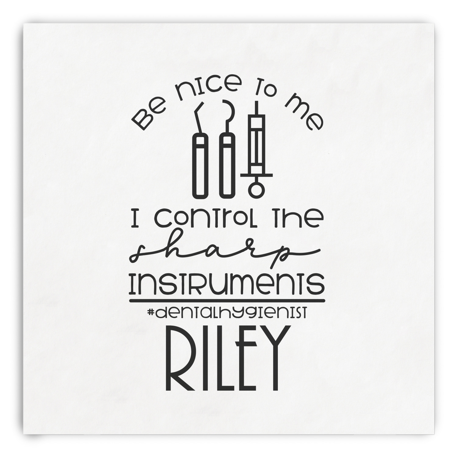 For the foreground, we used a fun quote that says "Be nice to me, I control sharp instruments #dental hygienist"Dental Hygienists bring the sparkle". We chose to personalize it with a name underneath. We used black for our color. You can customize the graphics, the colors as well as the personalization. Enjoy customizing it to make it yours.