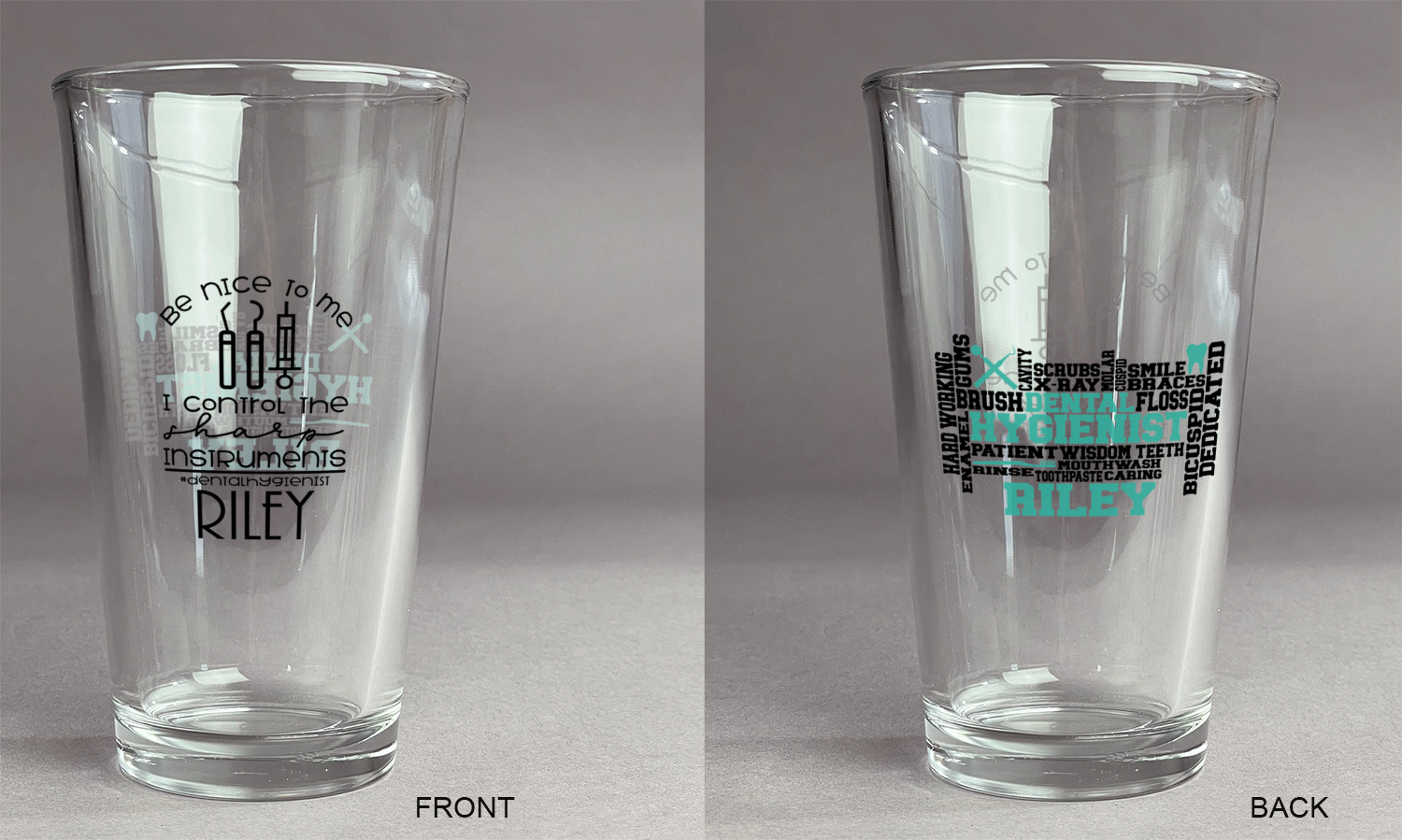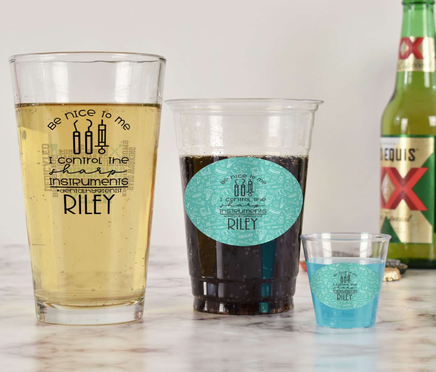 For the foreground, we used a fun quote that says "Be nice to me, I control sharp instruments #dental hygienist"Dental Hygienists bring the sparkle". We chose to personalize it with a name underneath. We used black for our color. You can customize the graphics, the colors as well as the personalization. Enjoy customizing it to make it yours.