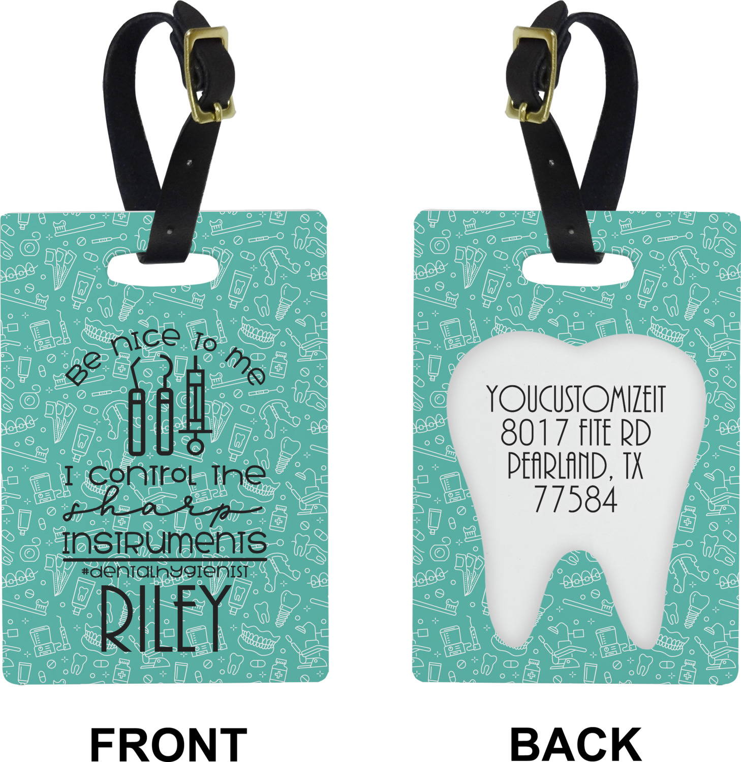 These personalized bag tags are sold in a variety of shapes, so that you may find the product that meets your vision exactly. We sell a round luggage tag, which measures at approximately 4" x 4". Our square luggage tag is about 3.5" x 3.5", while our rectangular version is 2.75" x 4 ".