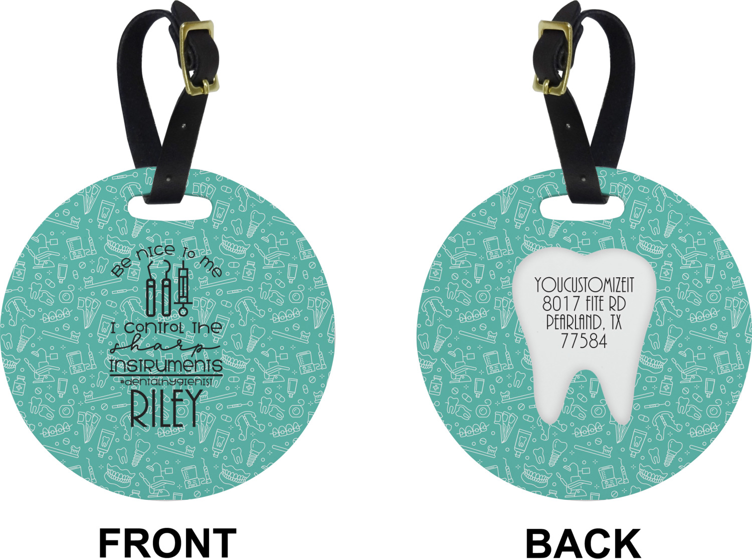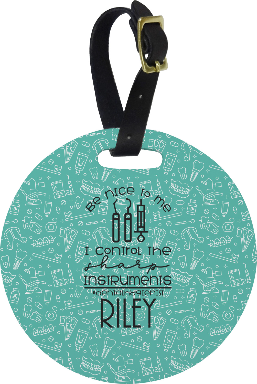 These personalized bag tags are sold in a variety of shapes, so that you may find the product that meets your vision exactly. We sell a round luggage tag, which measures at approximately 4" x 4". Our square luggage tag is about 3.5" x 3.5", while our rectangular version is 2.75" x 4 ".