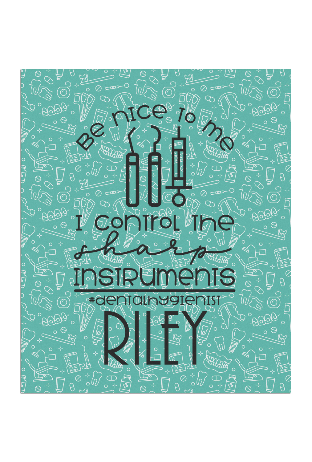 For the foreground, we used a fun quote that says "Be nice to me, I control sharp instruments #dental hygienist"Dental Hygienists bring the sparkle". We chose to personalize it with a name underneath. We used black for our color. You can customize the graphics, the colors as well as the personalization. Enjoy customizing it to make it yours.