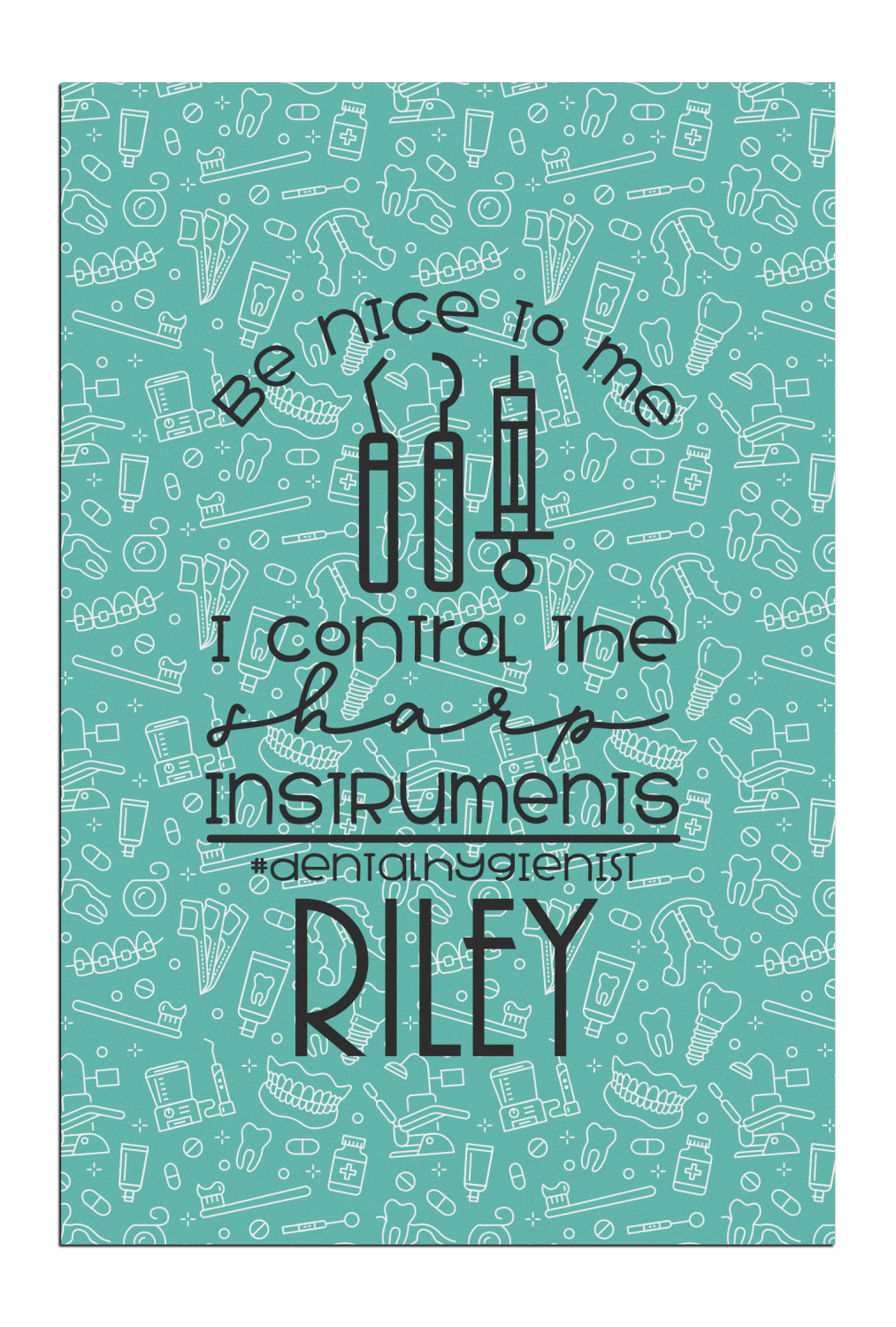 For the foreground, we used a fun quote that says "Be nice to me, I control sharp instruments #dental hygienist"Dental Hygienists bring the sparkle". We chose to personalize it with a name underneath. We used black for our color. You can customize the graphics, the colors as well as the personalization. Enjoy customizing it to make it yours.