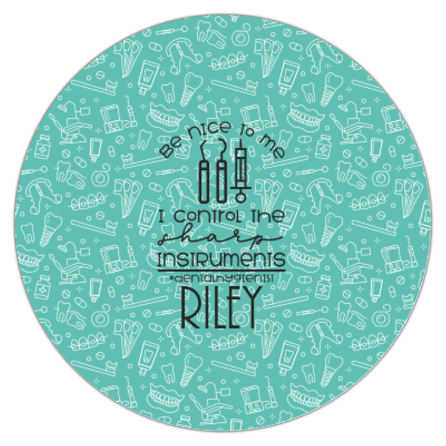 For the foreground, we used a fun quote that says "Be nice to me, I control sharp instruments #dental hygienist"Dental Hygienists bring the sparkle". We chose to personalize it with a name underneath. We used black for our color. You can customize the graphics, the colors as well as the personalization. Enjoy customizing it to make it yours.