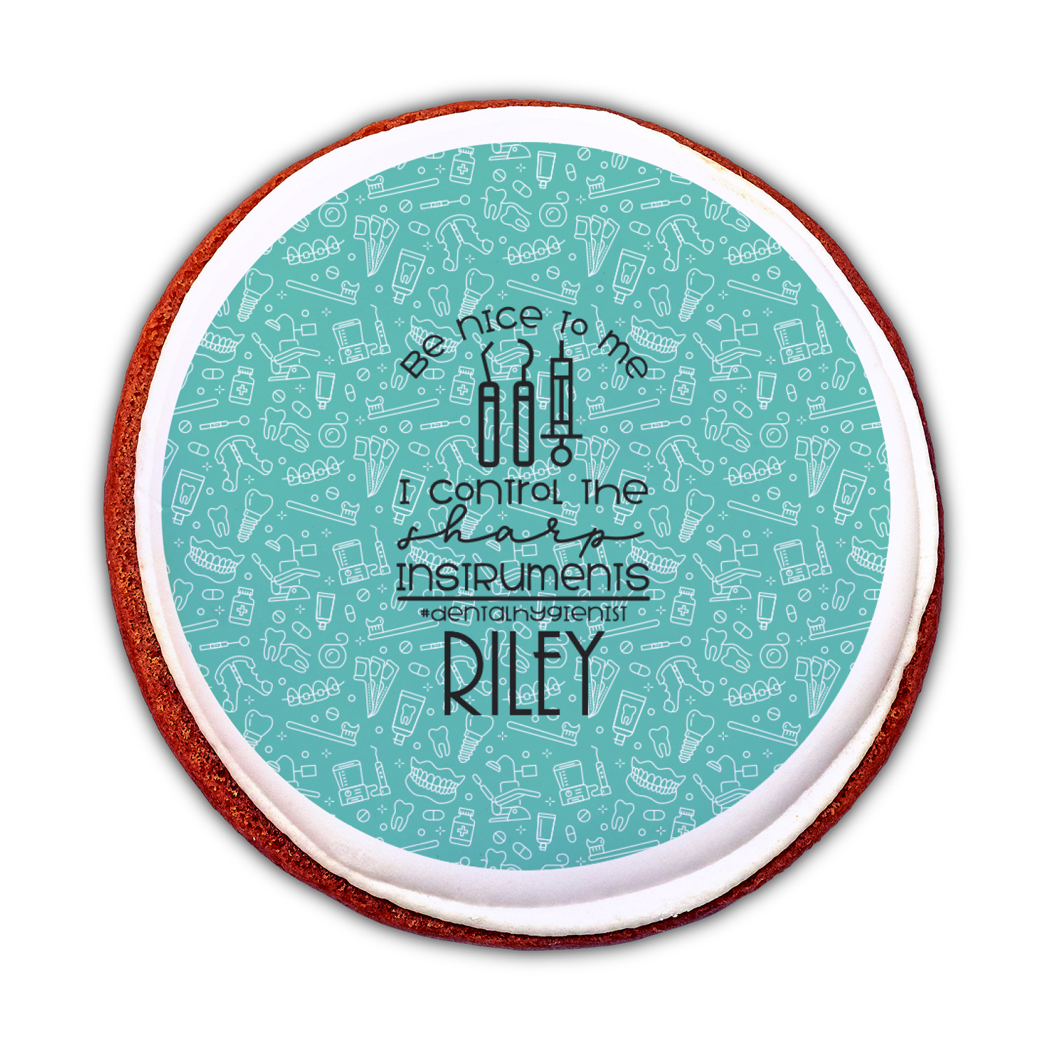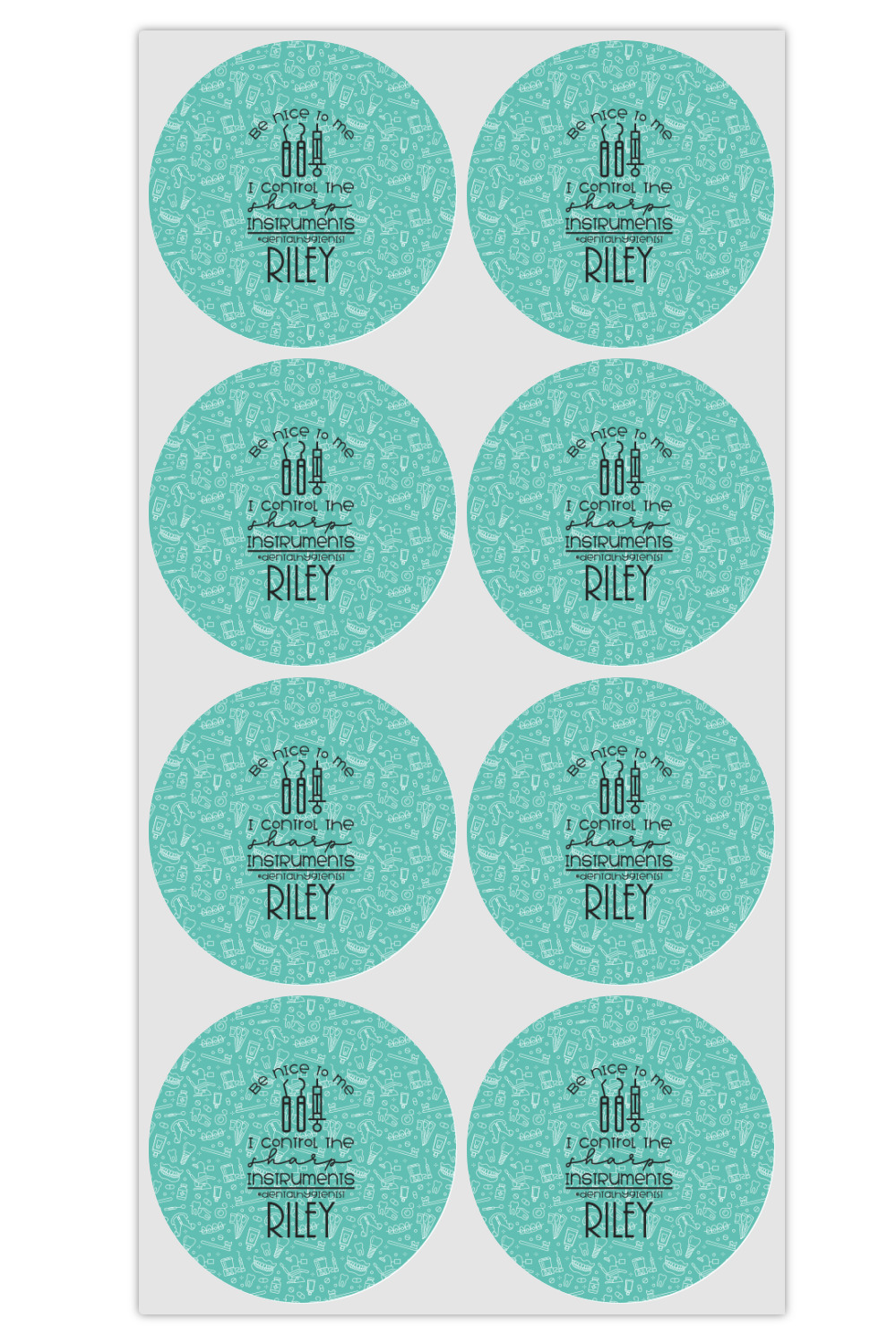 We choose a scrubs green background with line drawings of dental instruments in white. Both colors can be customized. We also have other dental themed backgrounds and hundreds of fun patterns that can easily be swapped out.