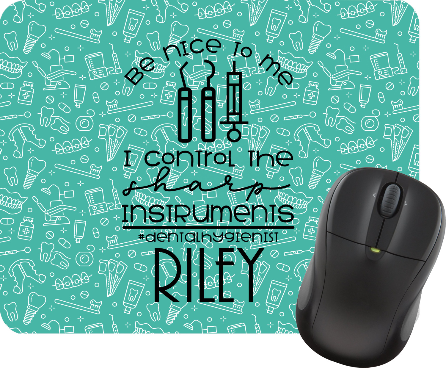 For the foreground, we used a fun quote that says "Be nice to me, I control sharp instruments #dental hygienist"Dental Hygienists bring the sparkle". We chose to personalize it with a name underneath. We used black for our color. You can customize the graphics, the colors as well as the personalization. Enjoy customizing it to make it yours.