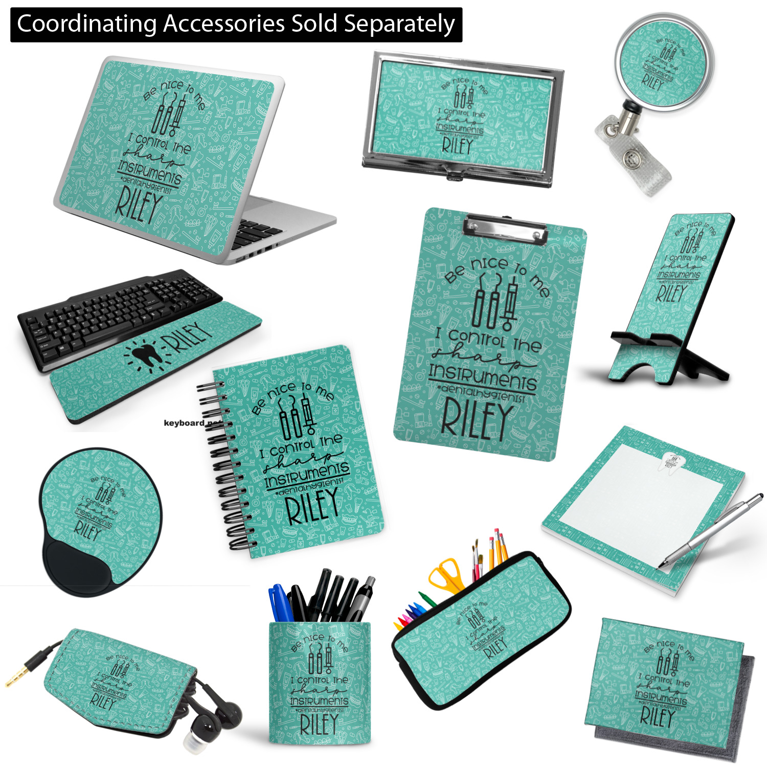 We choose a scrubs green background with line drawings of dental instruments in white. Both colors can be customized. We also have other dental themed backgrounds and hundreds of fun patterns that can easily be swapped out.