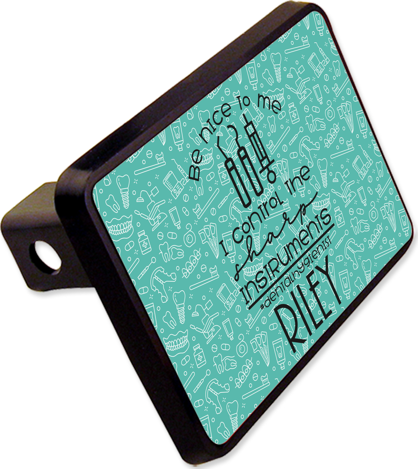 For the foreground, we used a fun quote that says "Be nice to me, I control sharp instruments #dental hygienist"Dental Hygienists bring the sparkle". We chose to personalize it with a name underneath. We used black for our color. You can customize the graphics, the colors as well as the personalization. Enjoy customizing it to make it yours.