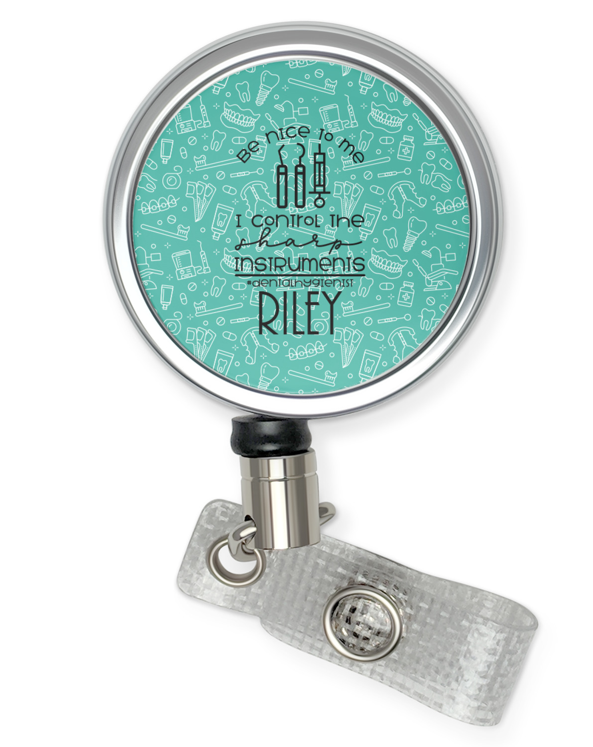 For the foreground, we used a fun quote that says "Be nice to me, I control sharp instruments #dental hygienist"Dental Hygienists bring the sparkle". We chose to personalize it with a name underneath. We used black for our color. You can customize the graphics, the colors as well as the personalization. Enjoy customizing it to make it yours.