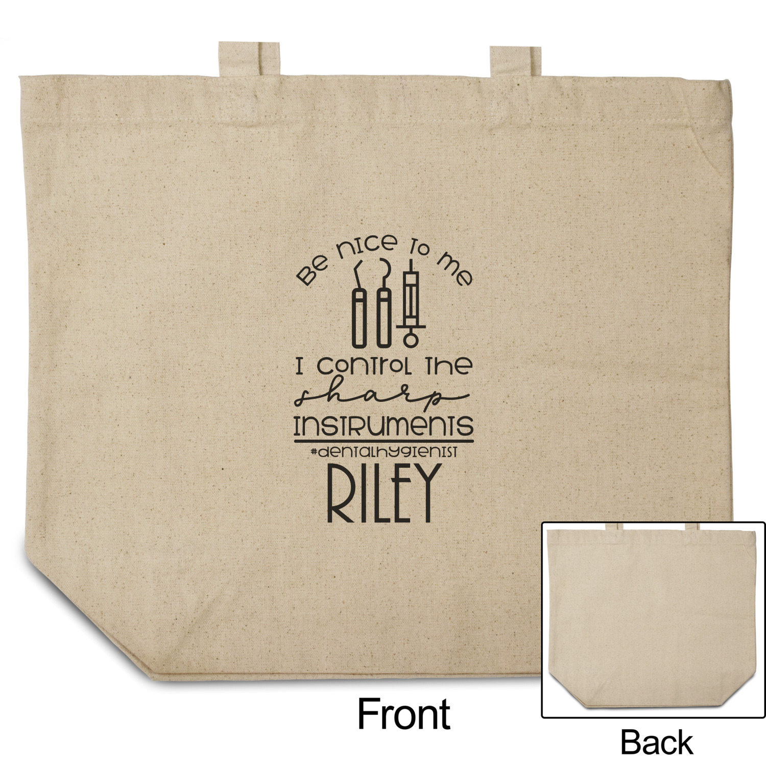For the foreground, we used a fun quote that says "Be nice to me, I control sharp instruments #dental hygienist"Dental Hygienists bring the sparkle". We chose to personalize it with a name underneath. We used black for our color. You can customize the graphics, the colors as well as the personalization. Enjoy customizing it to make it yours.