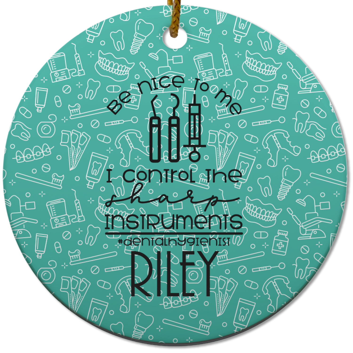 For the foreground, we used a fun quote that says "Be nice to me, I control sharp instruments #dental hygienist"Dental Hygienists bring the sparkle". We chose to personalize it with a name underneath. We used black for our color. You can customize the graphics, the colors as well as the personalization. Enjoy customizing it to make it yours.