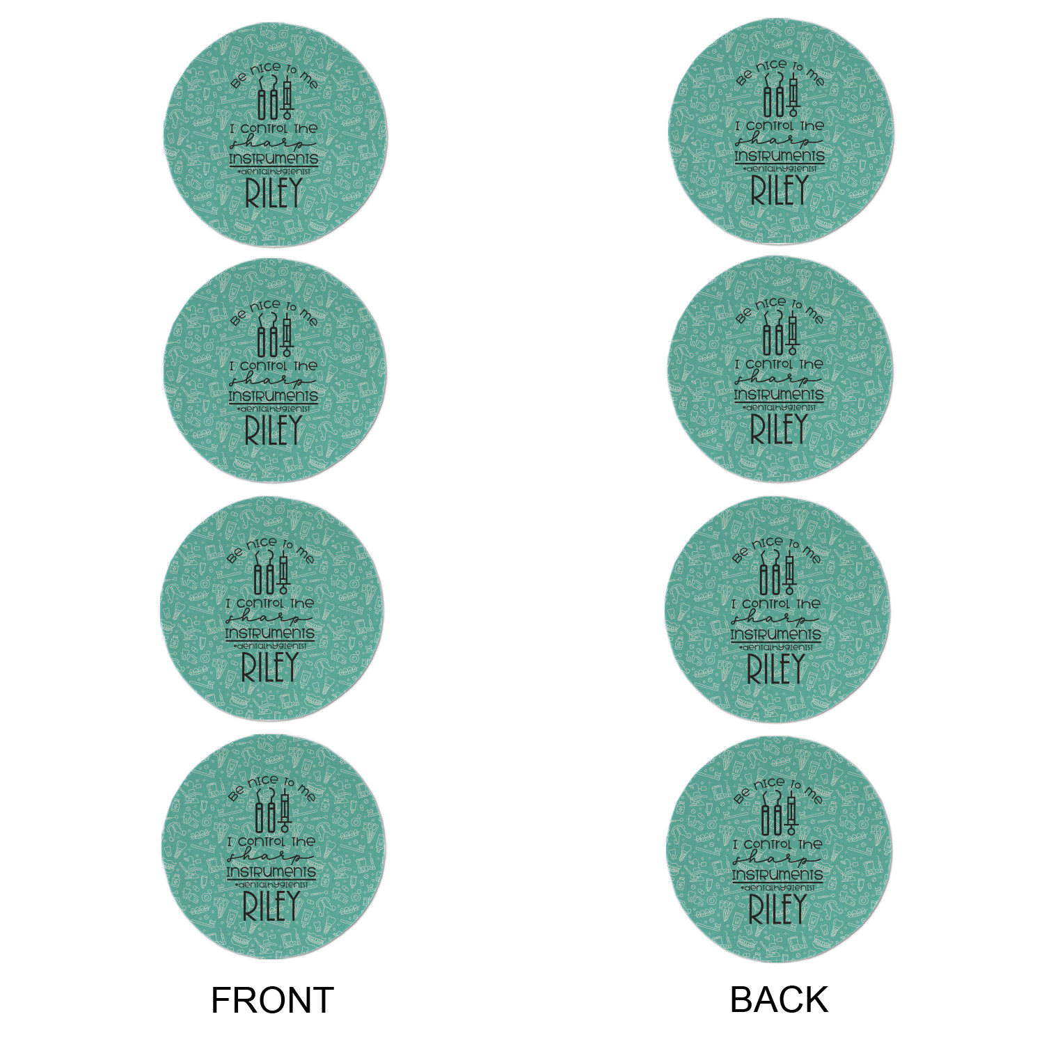For the foreground, we used a fun quote that says "Be nice to me, I control sharp instruments #dental hygienist"Dental Hygienists bring the sparkle". We chose to personalize it with a name underneath. We used black for our color. You can customize the graphics, the colors as well as the personalization. Enjoy customizing it to make it yours.