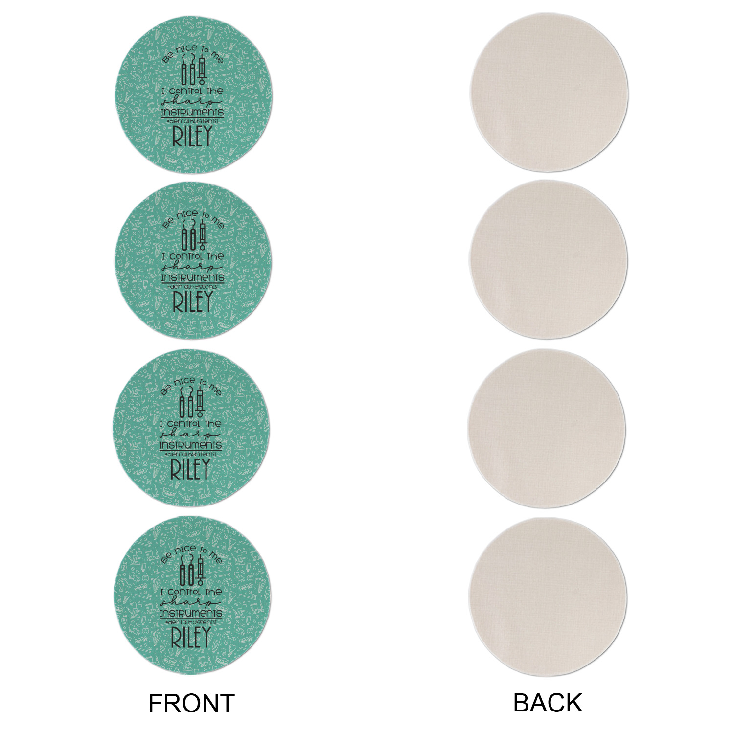 We choose a scrubs green background with line drawings of dental instruments in white. Both colors can be customized. We also have other dental themed backgrounds and hundreds of fun patterns that can easily be swapped out.