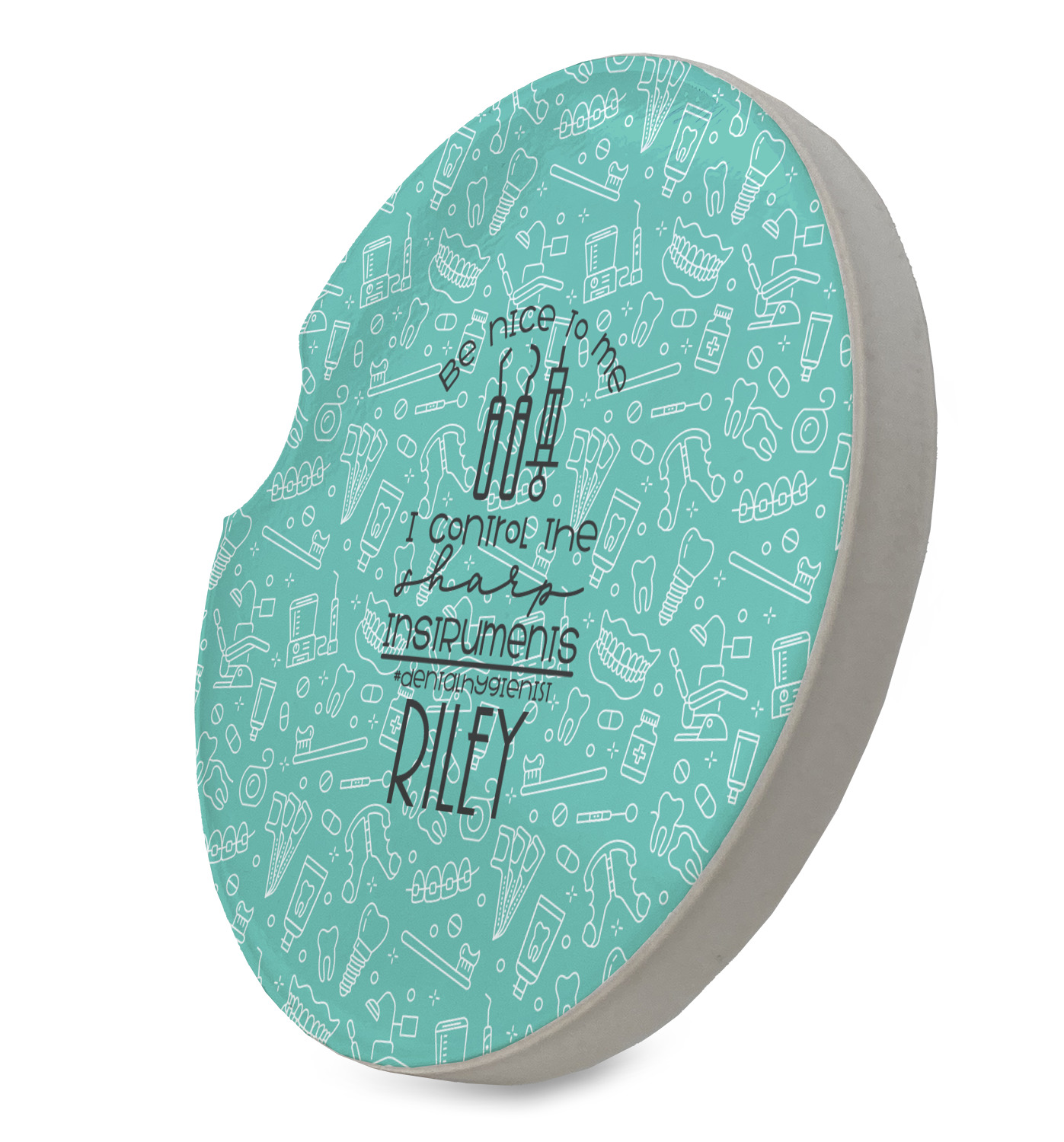 For the foreground, we used a fun quote that says "Be nice to me, I control sharp instruments #dental hygienist"Dental Hygienists bring the sparkle". We chose to personalize it with a name underneath. We used black for our color. You can customize the graphics, the colors as well as the personalization. Enjoy customizing it to make it yours.