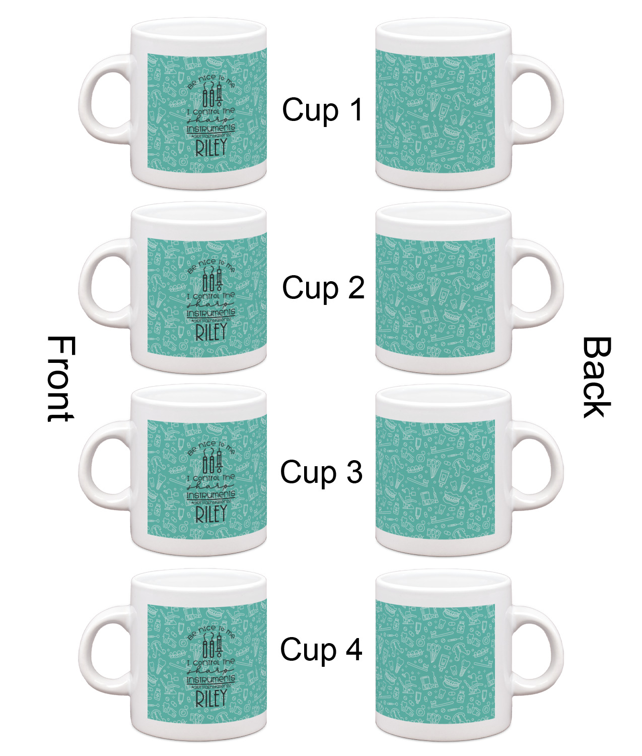 Each of our espresso mugs is a ceramic material sure to keep your drink warm. Personalize one cup for yourself, or order a set of 4! Its the perfect little gift for any coffee lover! We carry two sizes for you to personalize - 3 oz. (approx. 3.25" x 2.325" x 2.625") or 6 oz. (approx. 4" x 2.9" x 2.9"). Our 3 oz. mug is perfect for that single shot espresso while our 6 oz. mug can be your next favorite cappuccino cup holding two shots of espresso!