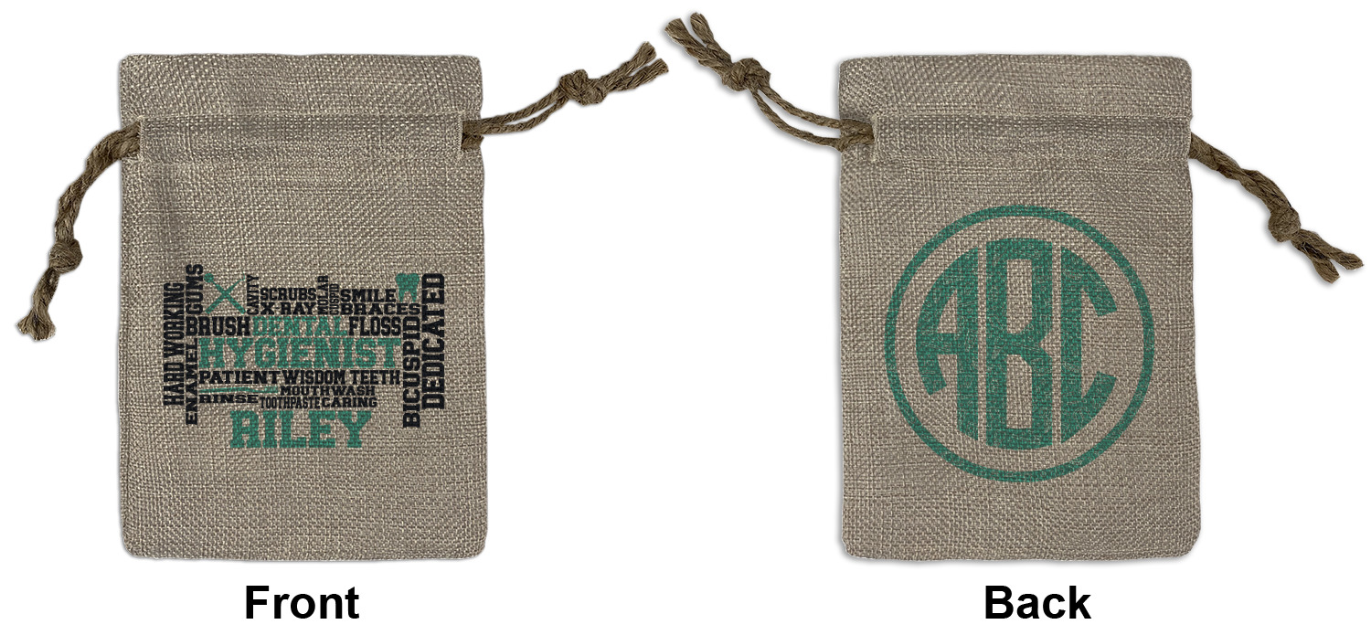 We sell our Burlap Gift Bags in 3 variant sized bags. Made with burlap polyester, each personalized bag can be secured with a twine drawstring pull. Your custom design is available to print on one side or both sides - completely up to you! The sizes of the bags measure approximately 4.5" x 6.5" for the smallest size, 6.5" x 8.0" for the medium size, and 6.5" x 13.5" for the large-sized bag.