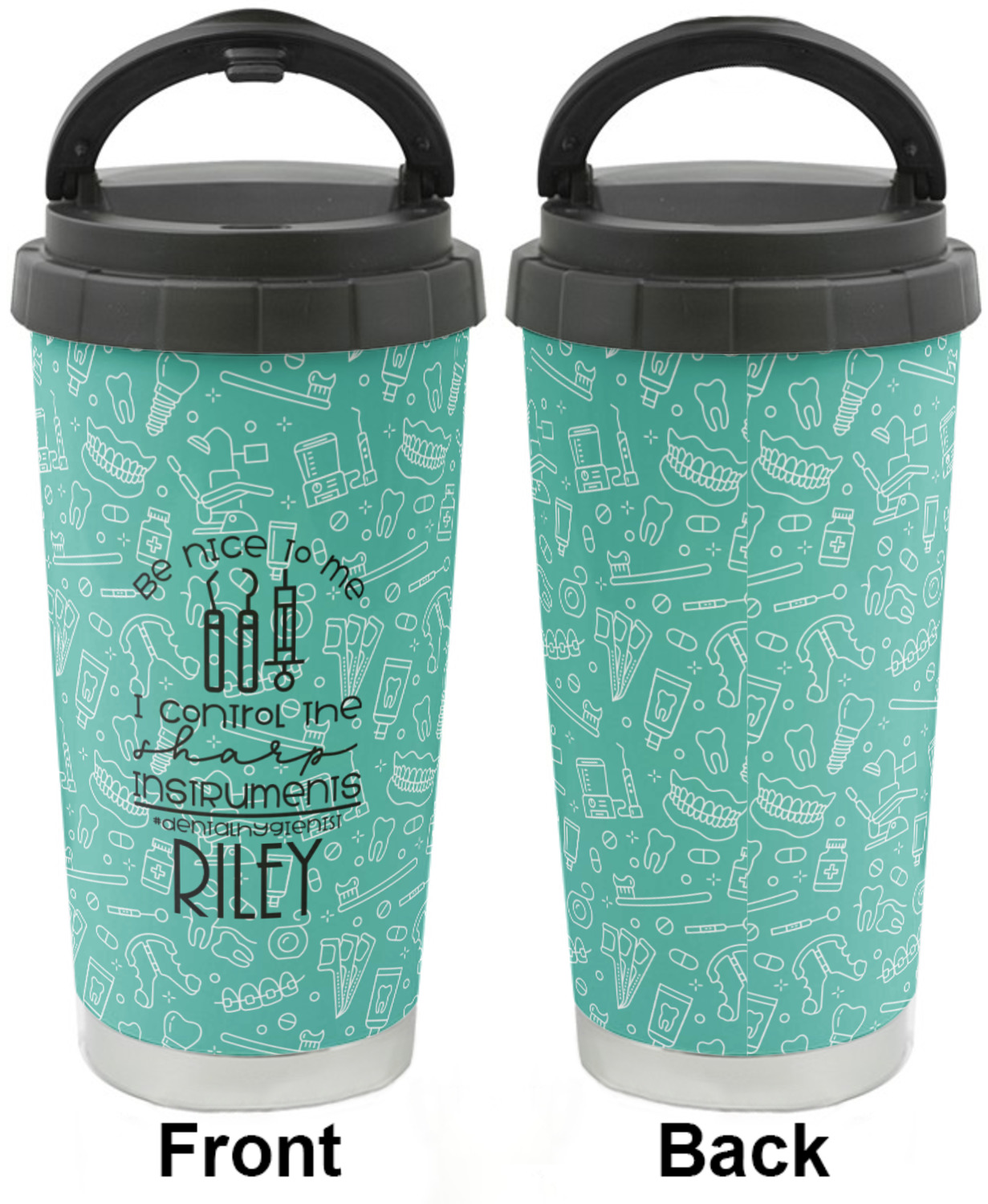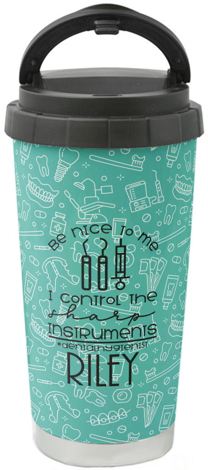For the foreground, we used a fun quote that says "Be nice to me, I control sharp instruments #dental hygienist"Dental Hygienists bring the sparkle". We chose to personalize it with a name underneath. We used black for our color. You can customize the graphics, the colors as well as the personalization. Enjoy customizing it to make it yours.