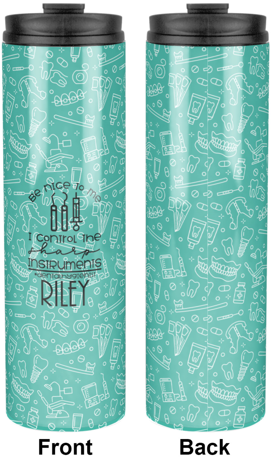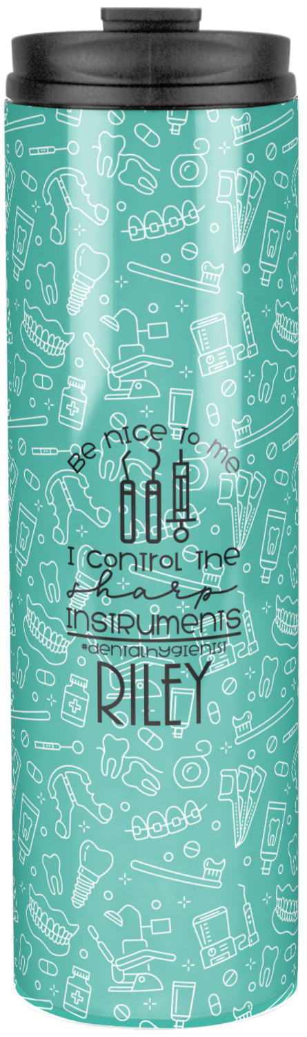 For the foreground, we used a fun quote that says "Be nice to me, I control sharp instruments #dental hygienist"Dental Hygienists bring the sparkle". We chose to personalize it with a name underneath. We used black for our color. You can customize the graphics, the colors as well as the personalization. Enjoy customizing it to make it yours.