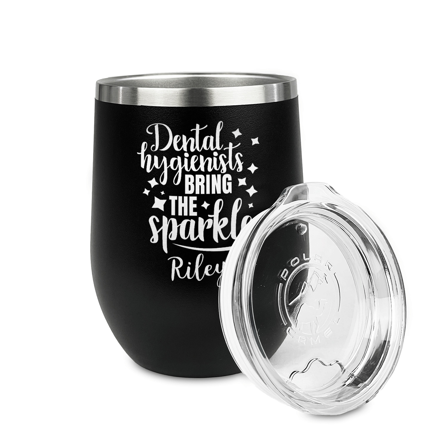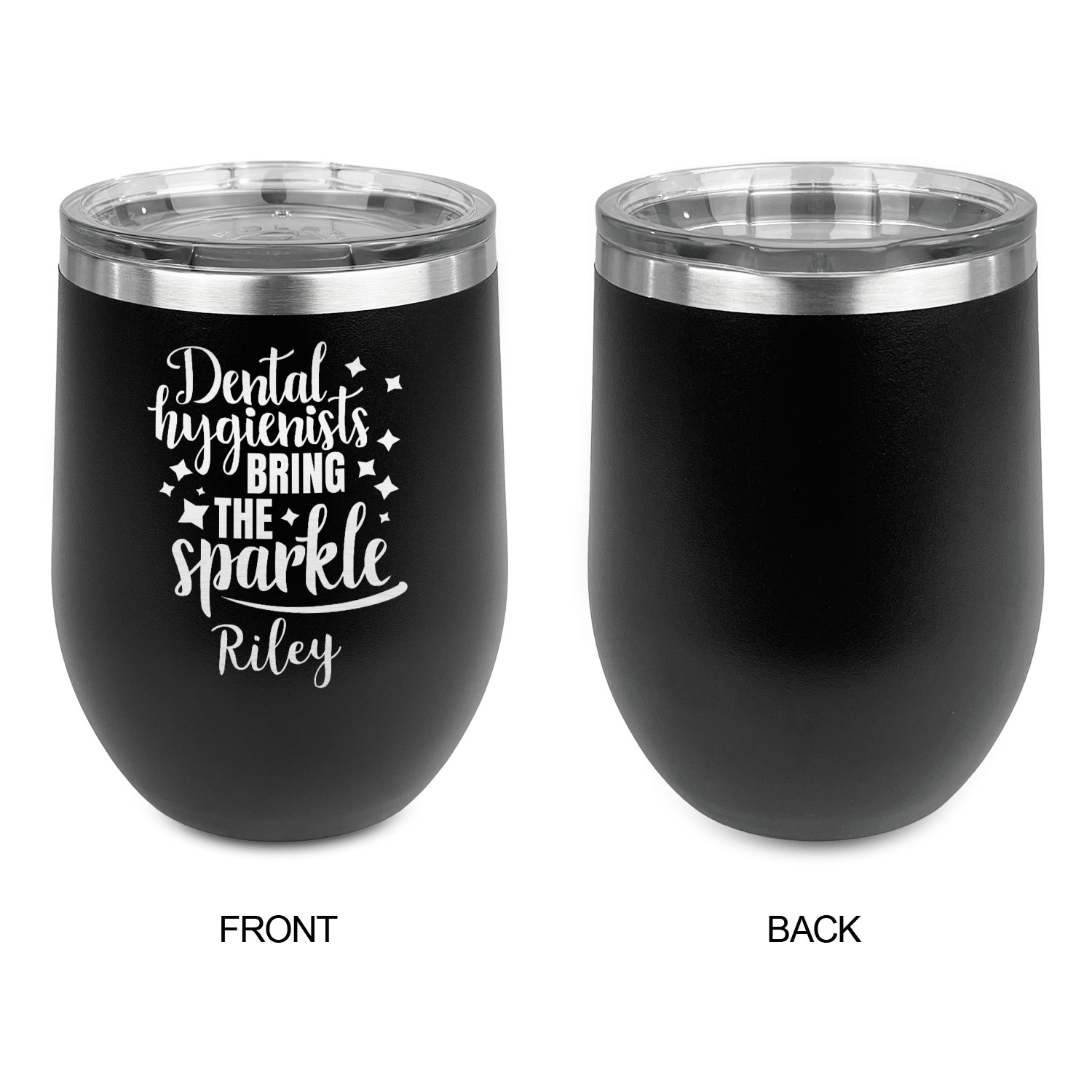 For the foreground, we used a fun quote that says "Be nice to me, I control sharp instruments #dental hygienist"Dental Hygienists bring the sparkle". We chose to personalize it with a name underneath. We used black for our color. You can customize the graphics, the colors as well as the personalization. Enjoy customizing it to make it yours.