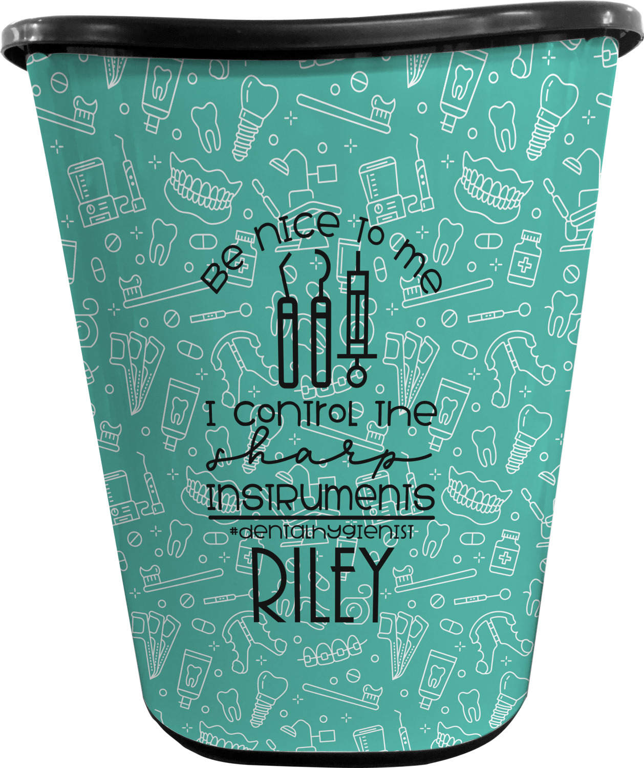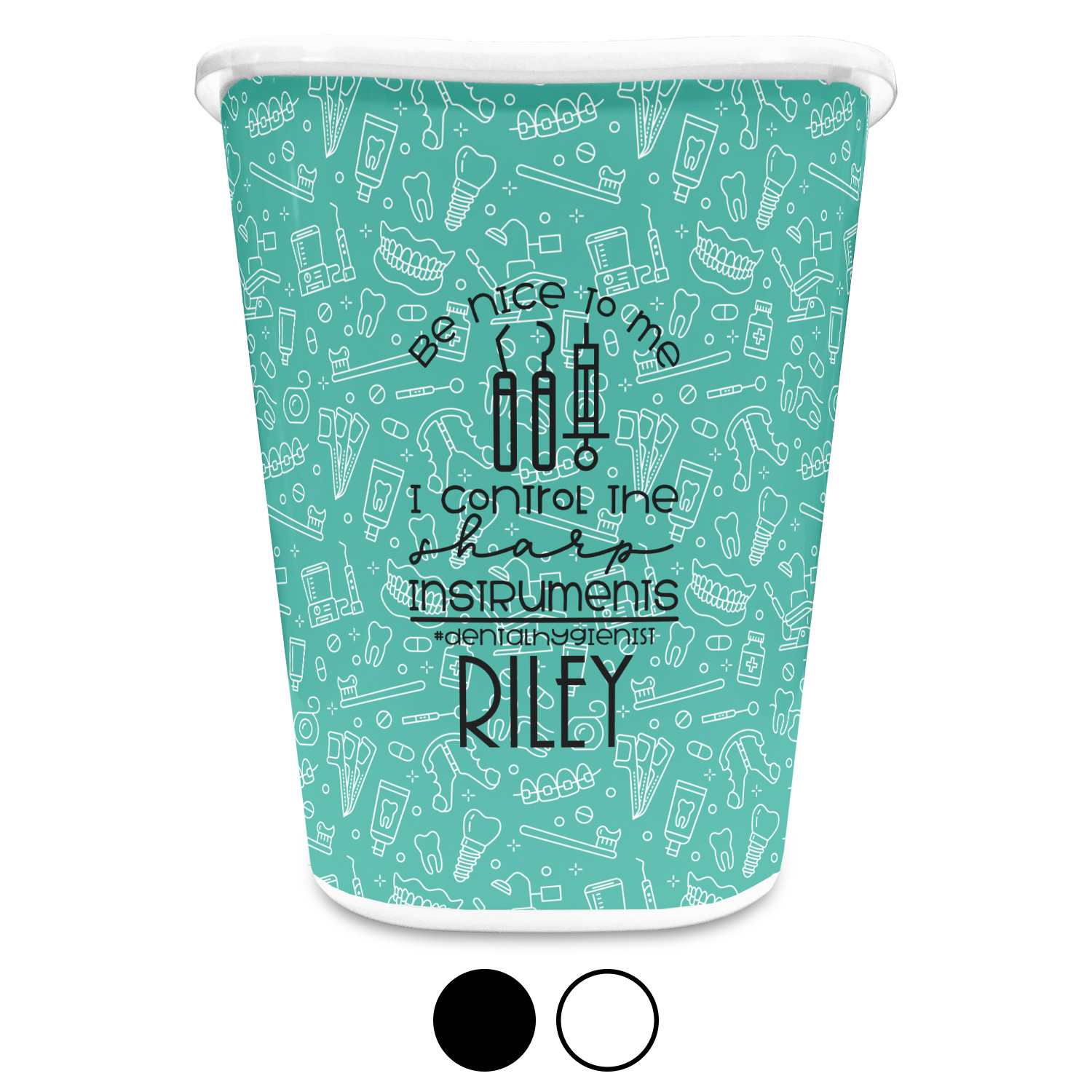 For the foreground, we used a fun quote that says "Be nice to me, I control sharp instruments #dental hygienist"Dental Hygienists bring the sparkle". We chose to personalize it with a name underneath. We used black for our color. You can customize the graphics, the colors as well as the personalization. Enjoy customizing it to make it yours.