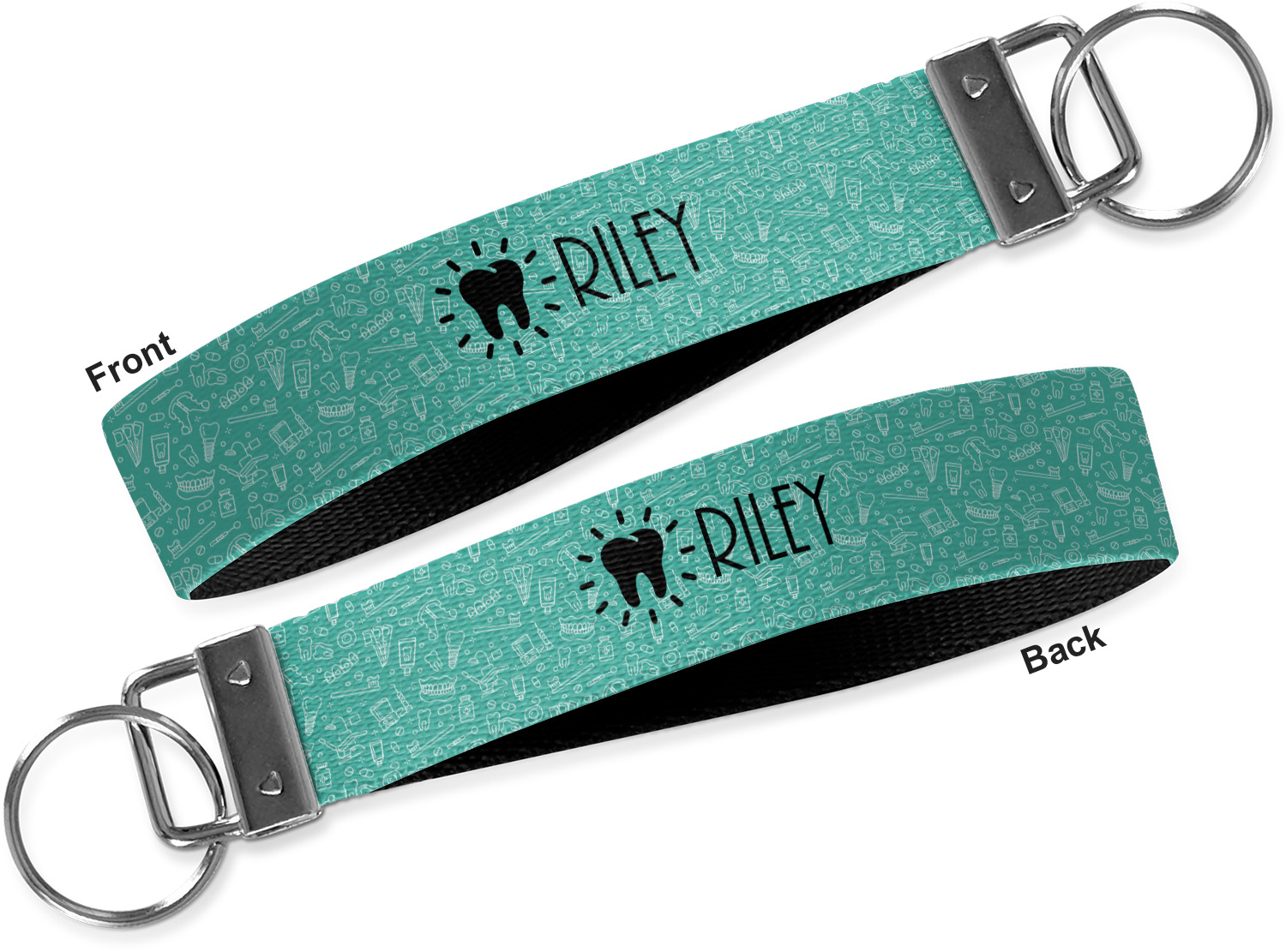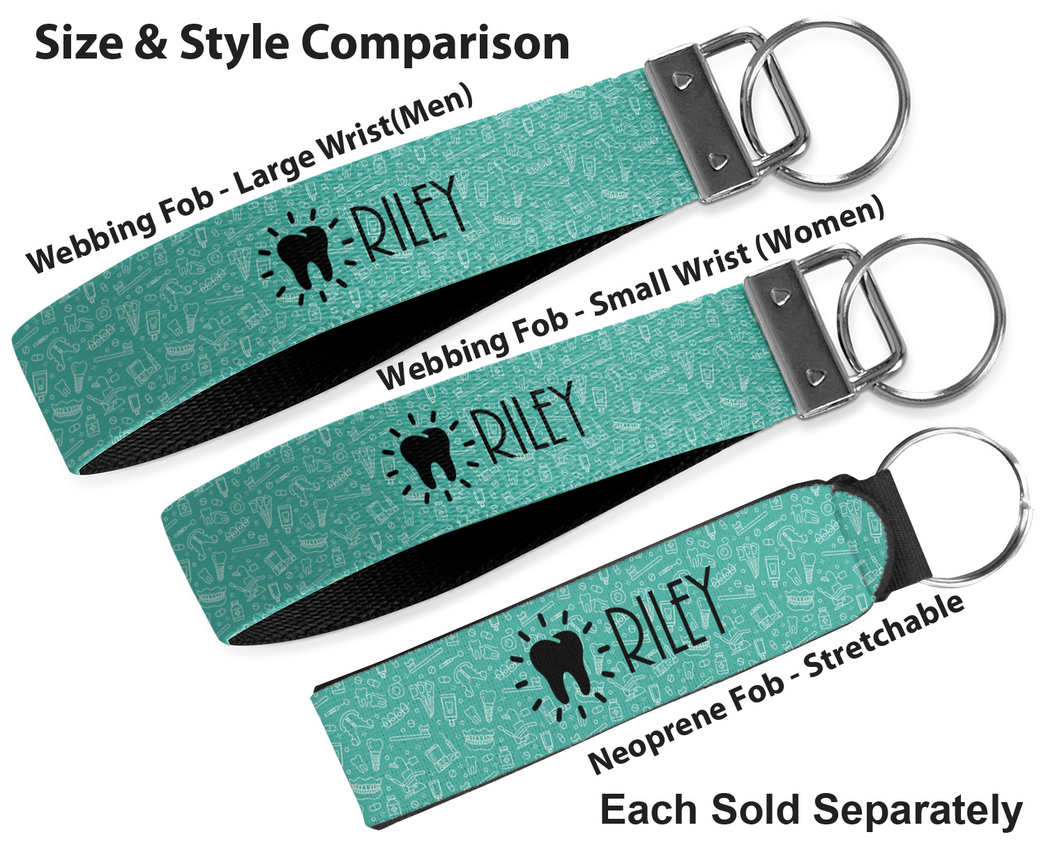 These key fob keychains are made from a polyester weave, right here in the USA. They feature a silver, metal clasp, attached to a round keyring. The piece gives the personalized wristlet a beautiful, finished look. Your customized design is printed on the outside of the keychain strap. We carry these wristlets in two sizes: small, which is 5 inches in width, and large, which is 5.5 inches in width.