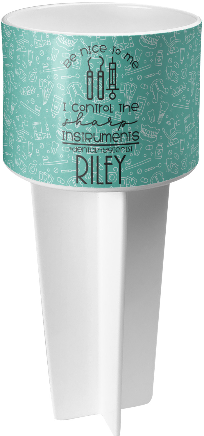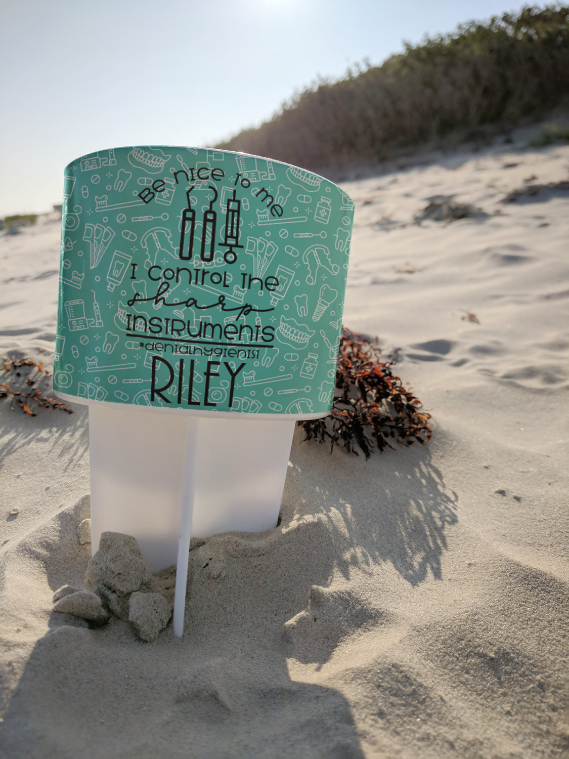 For the foreground, we used a fun quote that says "Be nice to me, I control sharp instruments #dental hygienist"Dental Hygienists bring the sparkle". We chose to personalize it with a name underneath. We used black for our color. You can customize the graphics, the colors as well as the personalization. Enjoy customizing it to make it yours.