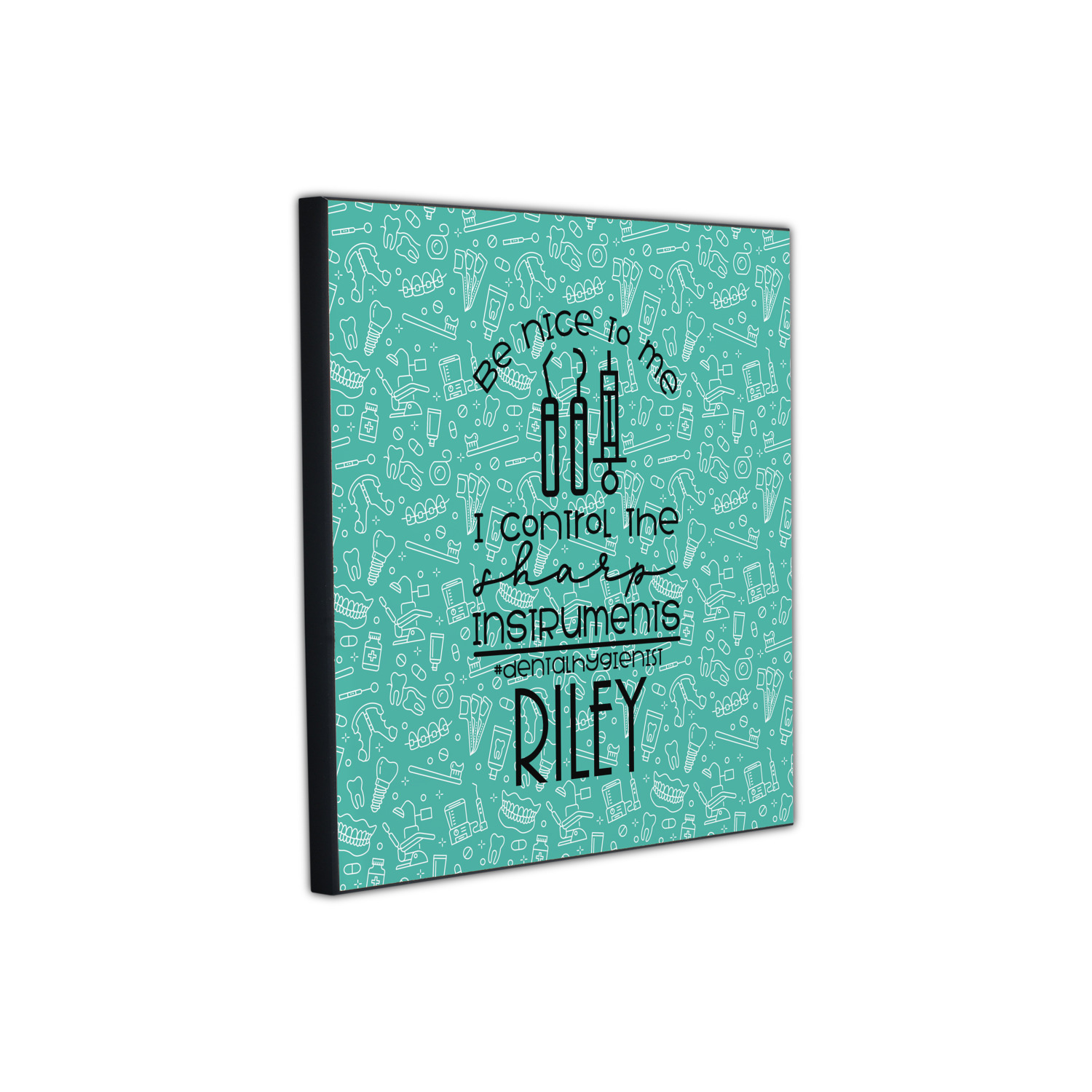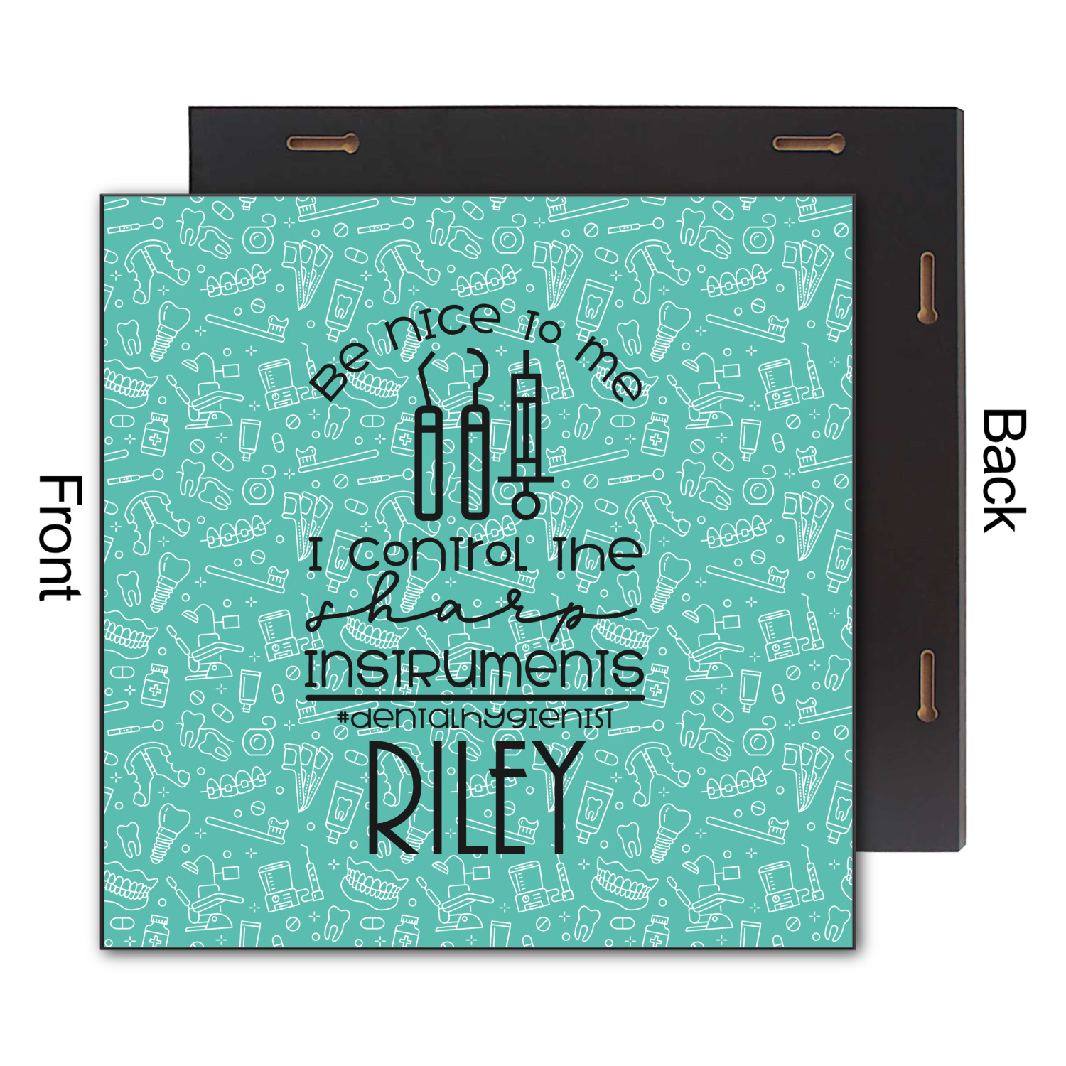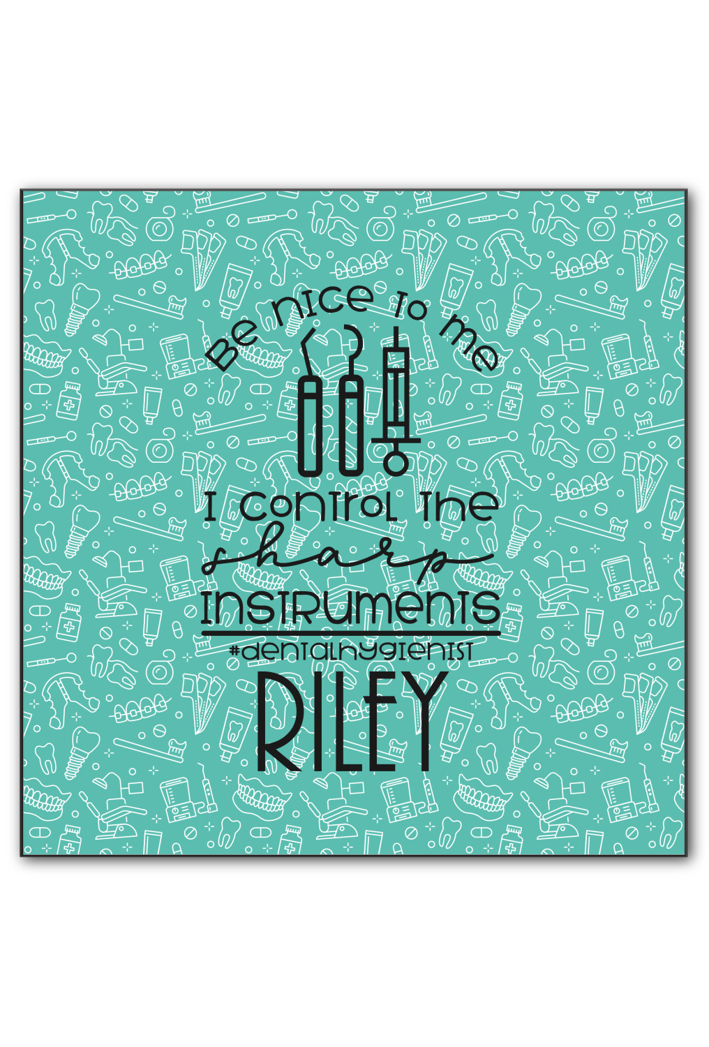 For the foreground, we used a fun quote that says "Be nice to me, I control sharp instruments #dental hygienist"Dental Hygienists bring the sparkle". We chose to personalize it with a name underneath. We used black for our color. You can customize the graphics, the colors as well as the personalization. Enjoy customizing it to make it yours.