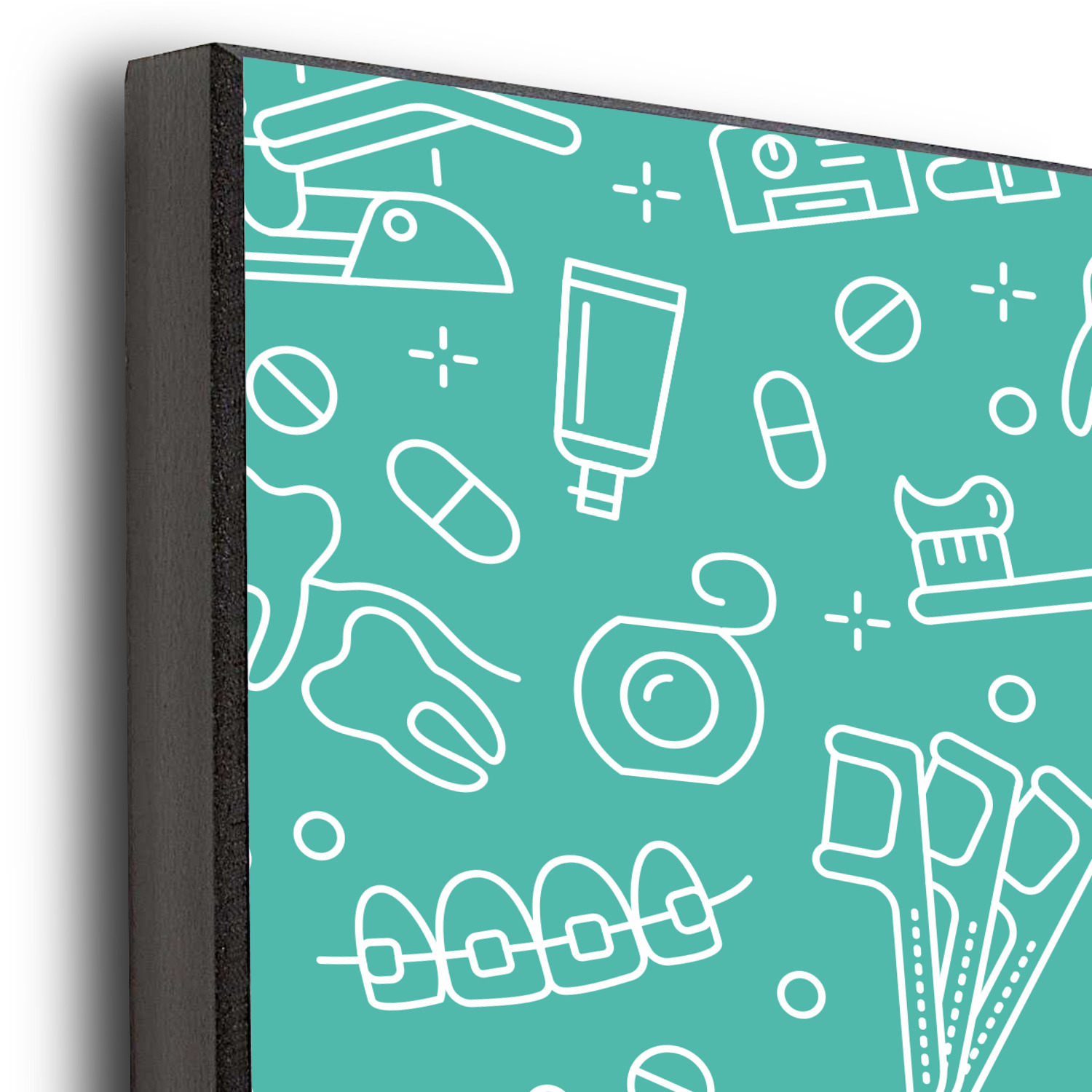 We choose a scrubs green background with line drawings of dental instruments in white. Both colors can be customized. We also have other dental themed backgrounds and hundreds of fun patterns that can easily be swapped out.