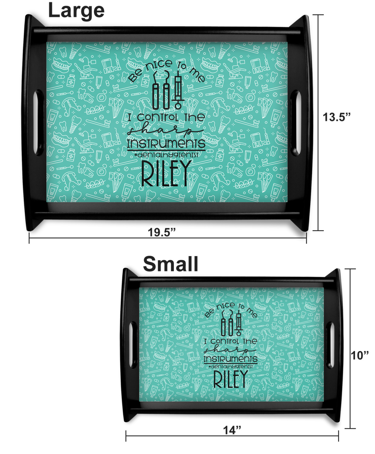 This serving tray with handles features square edges and two rounded sides, creating a very modern look. Each side is fabricated from a beautifully cut, natural wood. The bottom of the interior of the tray displays your customized design in bright, vibrant color. The tray is sold in both a black color and a natural wood look. Each variation of the wood serving tray has two sizes: Small, which is 14" x 10" x 2.25", and Large, which is 19.5" x 13.5" x 2.75".