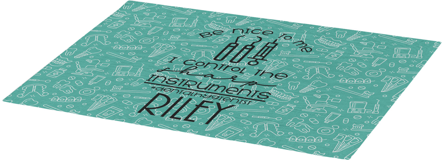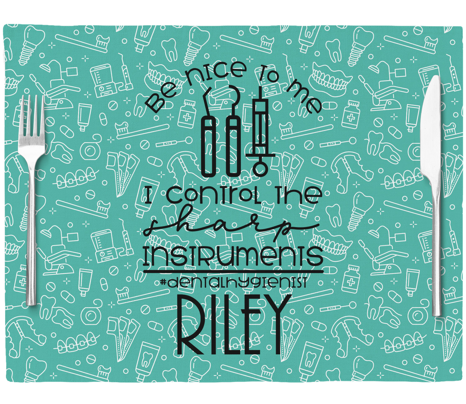 We choose a scrubs green background with line drawings of dental instruments in white. Both colors can be customized. We also have other dental themed backgrounds and hundreds of fun patterns that can easily be swapped out.