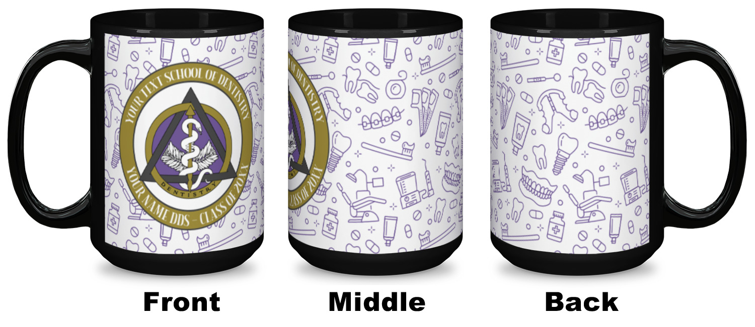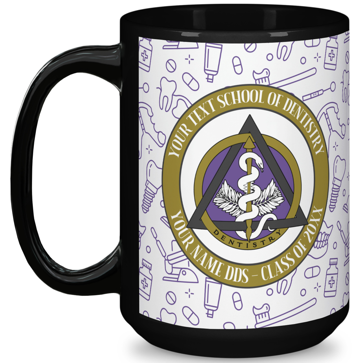 This design features the dental insignia (aka emblem, symbol, logo) at the center with personalization in a circle around the emblem.You can customize the name of the dental school, as well as the name of the dentist and the year they graduated.