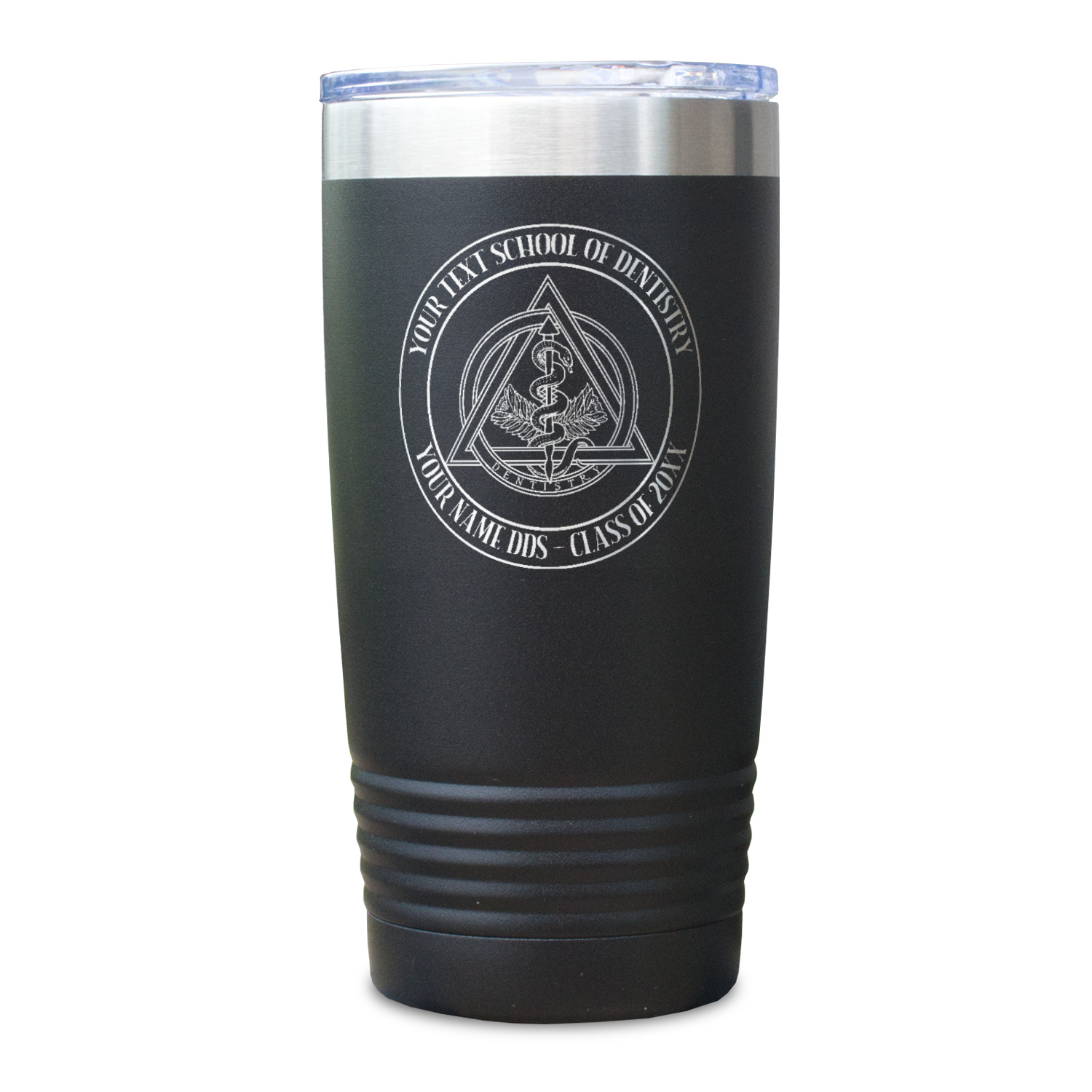 This design features the dental insignia (aka emblem, symbol, logo) at the center with personalization in a circle around the emblem.You can customize the name of the dental school, as well as the name of the dentist and the year they graduated.