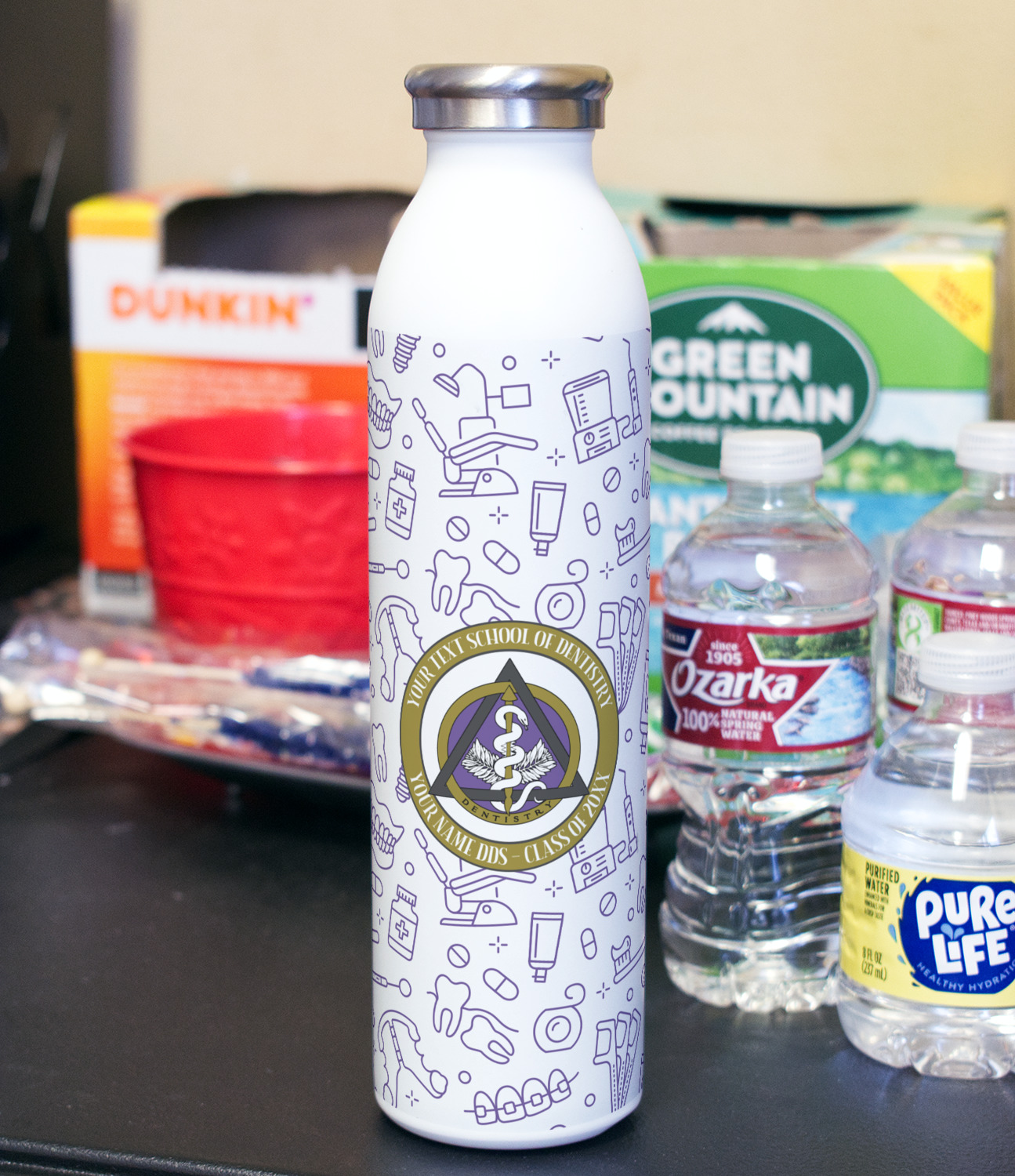 This design features the dental insignia (aka emblem, symbol, logo) at the center with personalization in a circle around the emblem.You can customize the name of the dental school, as well as the name of the dentist and the year they graduated.