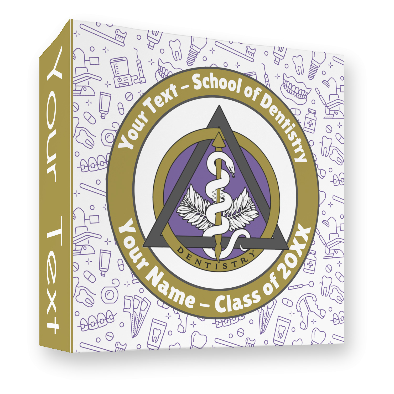 This design features the dental insignia (aka emblem, symbol, logo) at the center with personalization in a circle around the emblem.You can customize the name of the dental school, as well as the name of the dentist and the year they graduated.