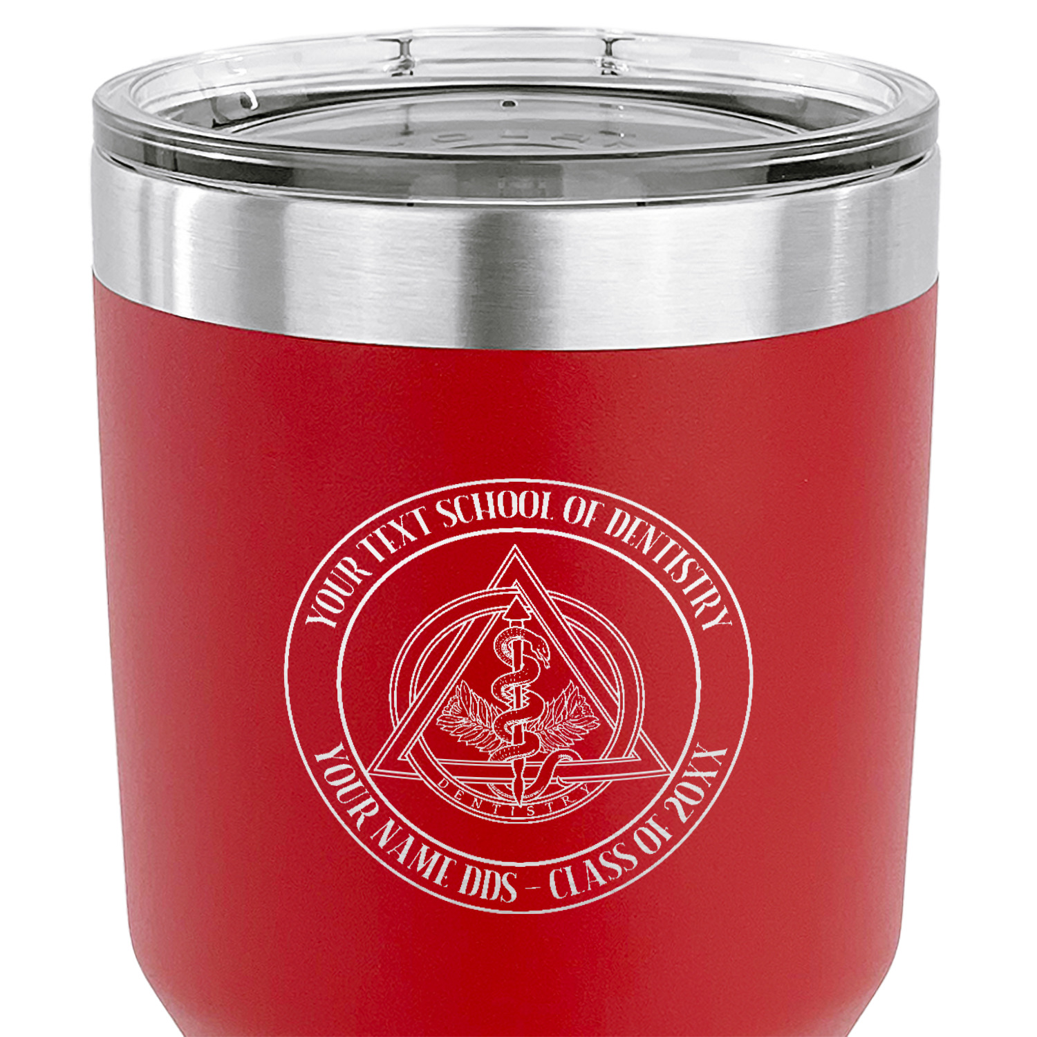 This design features the dental insignia (aka emblem, symbol, logo) at the center with personalization in a circle around the emblem.You can customize the name of the dental school, as well as the name of the dentist and the year they graduated.
