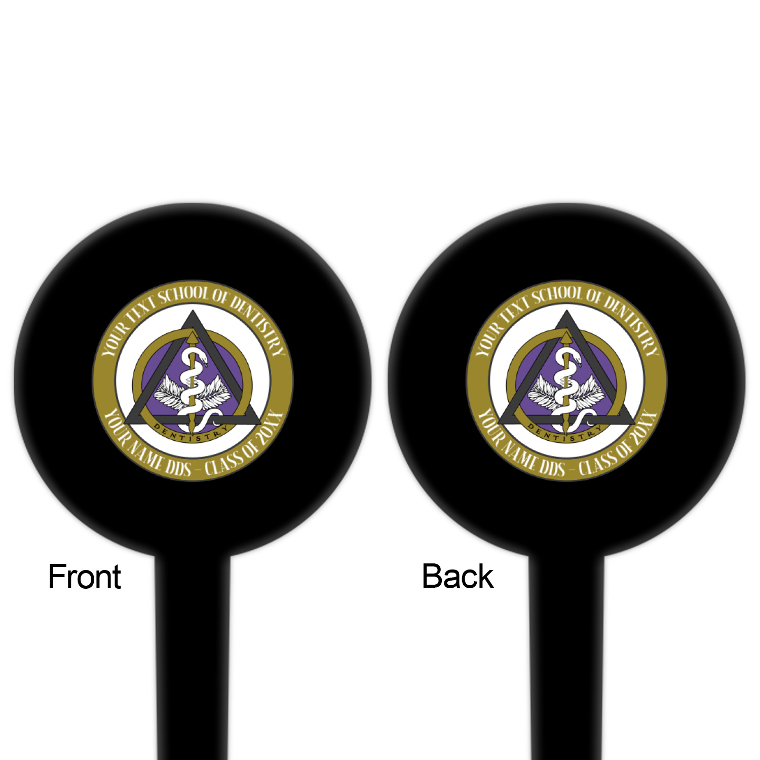 This design features the dental insignia (aka emblem, symbol, logo) at the center with personalization in a circle around the emblem.You can customize the name of the dental school, as well as the name of the dentist and the year they graduated.