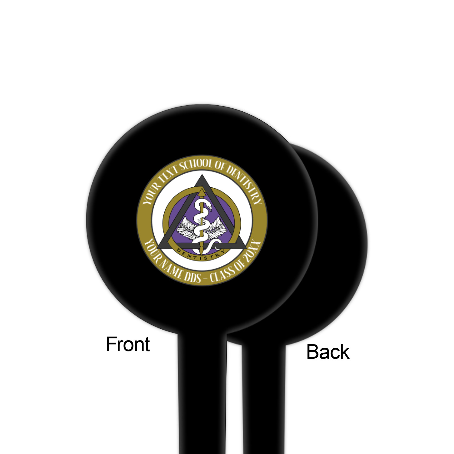 This design features the dental insignia (aka emblem, symbol, logo) at the center with personalization in a circle around the emblem.You can customize the name of the dental school, as well as the name of the dentist and the year they graduated.